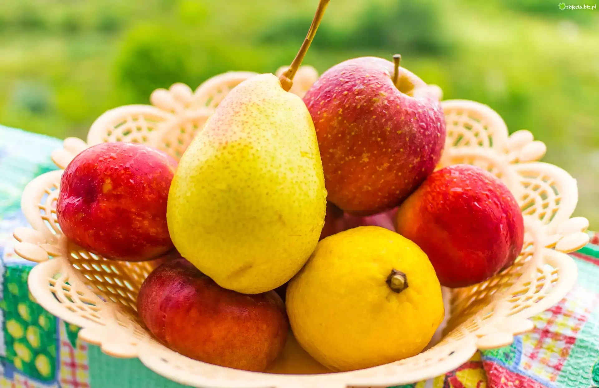 Zdjęcie Owoce, Gruszka, Jabłka, Cytryna, Nektarynki, Krople, Koszyk