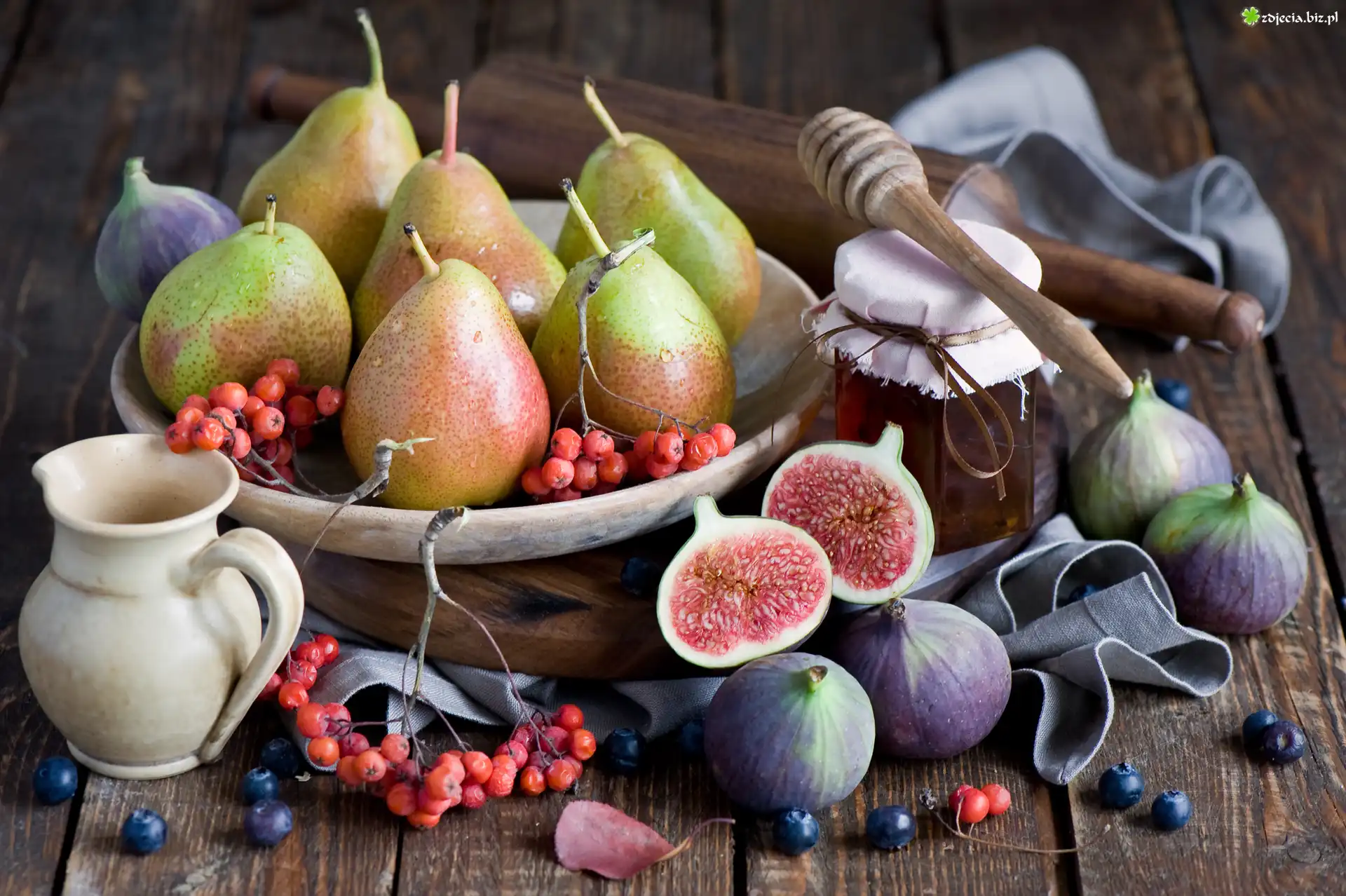Zdjęcie Kompozycja, Gruszki, Figi, Miód, Jarzębina, Miska, Dzbanek, Wałek