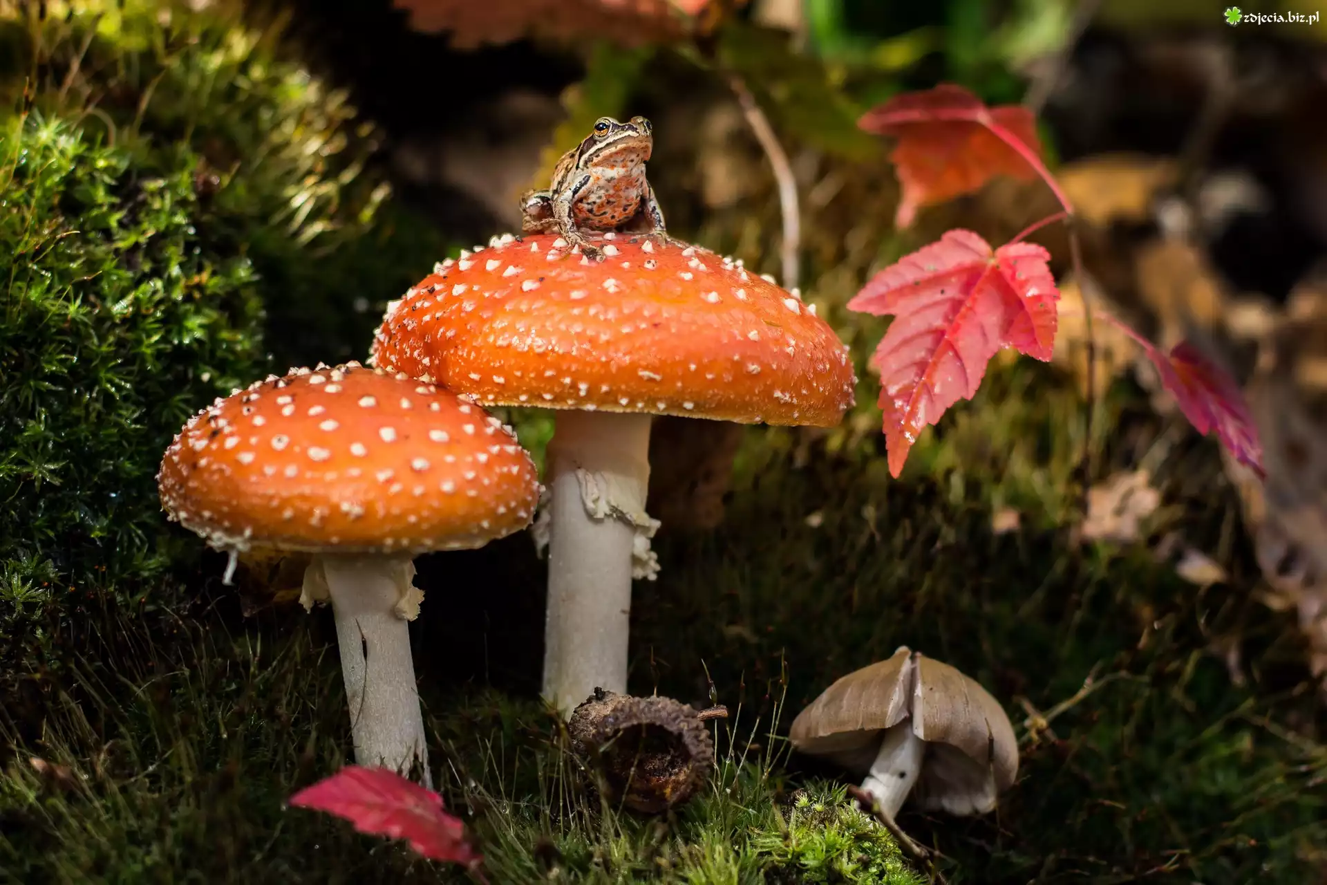 Zdjęcie Grzyby, Muchomory, Liście, Trawa, Żaba, Roślinność