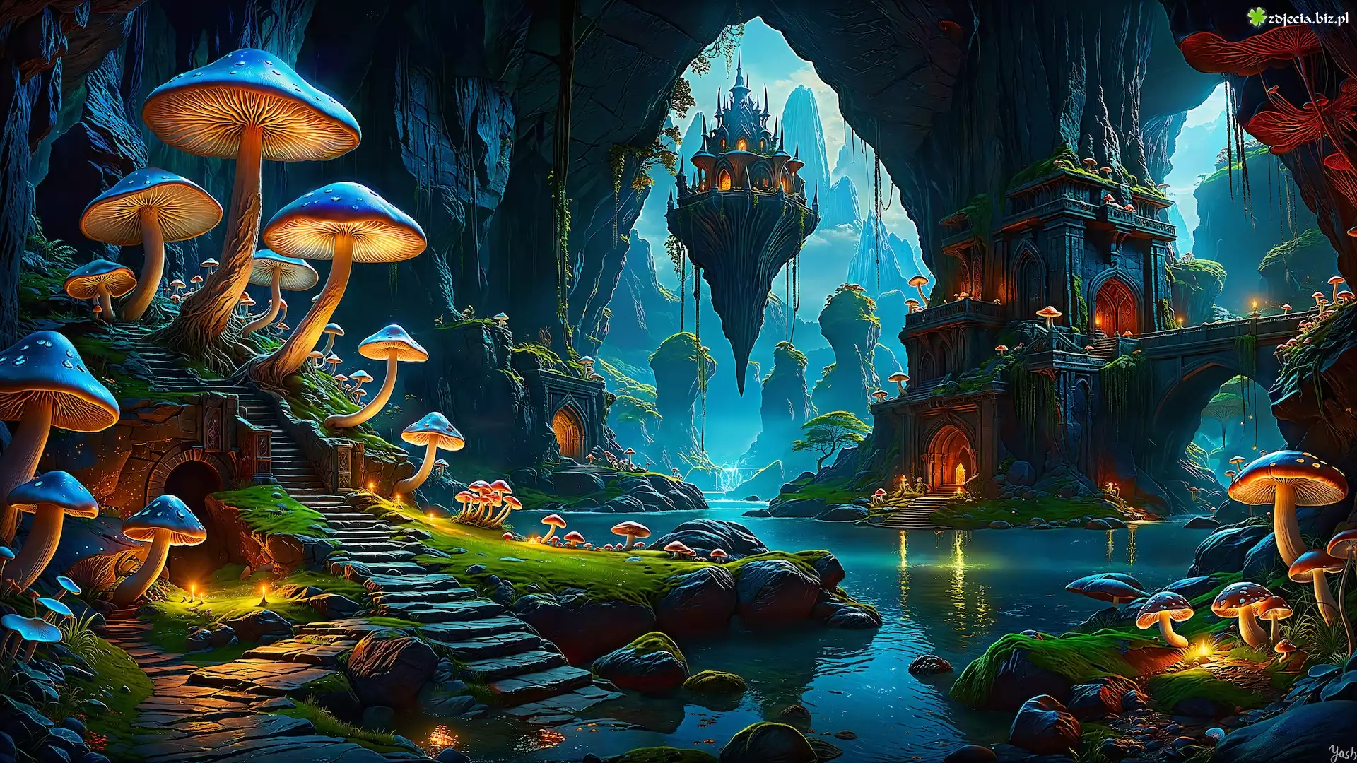 Zdjęcie Rzeka, Jaskinia, Drzewa, Grzyby, Schody, Fantasy