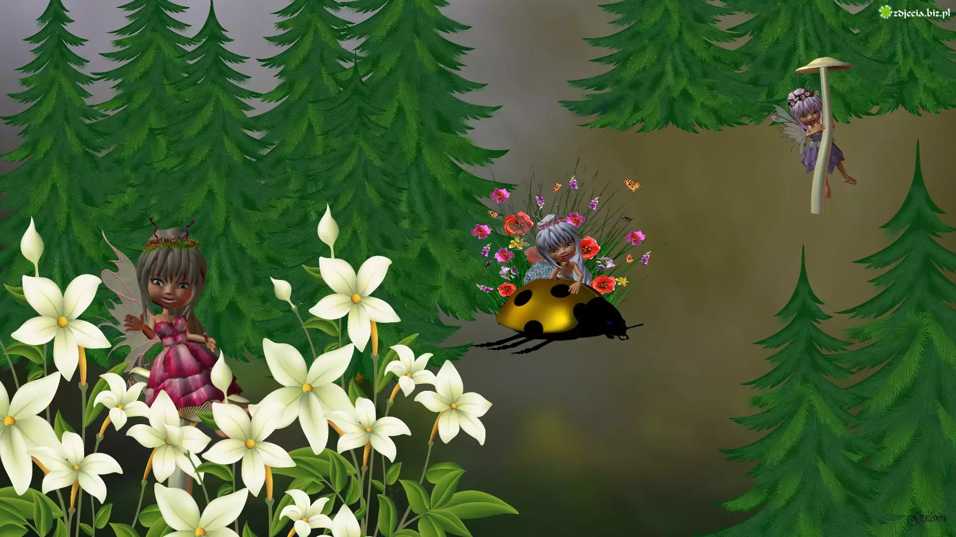 Zdjęcie Laleczki, Grzyby, Owad, Kwiaty, Las, Świerki, Grafika