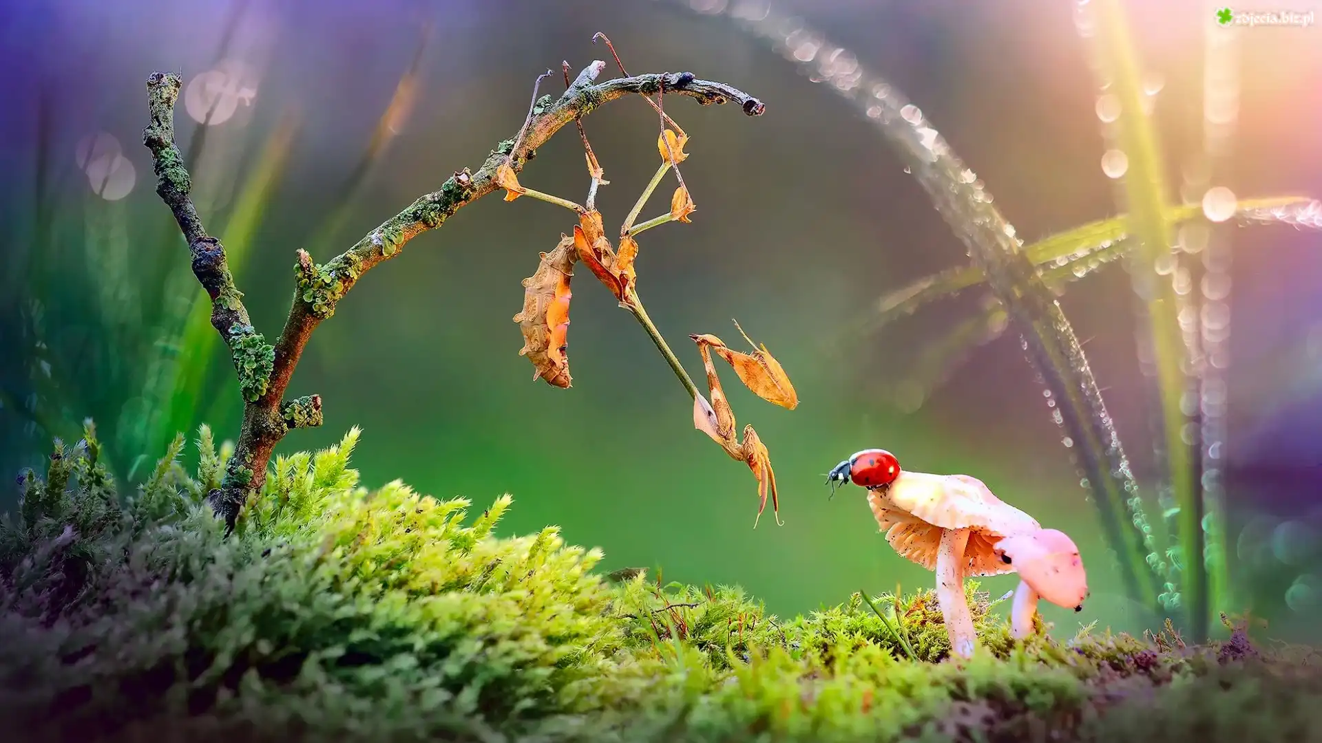 Zdjęcie Grzyby, Biedronka, Modliszka, Mech, Gałązka