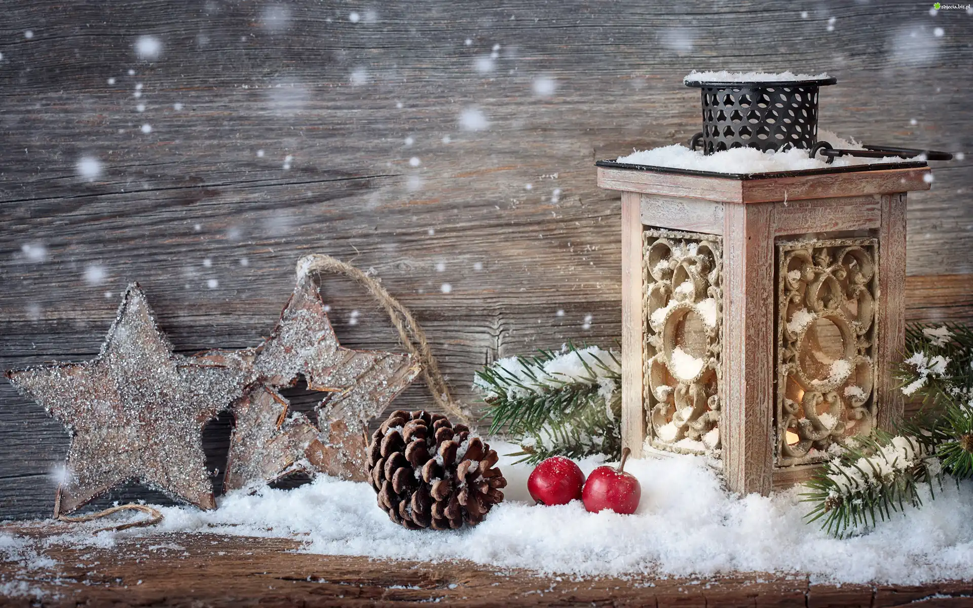 Zdjęcie, Gwiazdki, Szyszka, Lampion, Kompozycja, Świąteczna