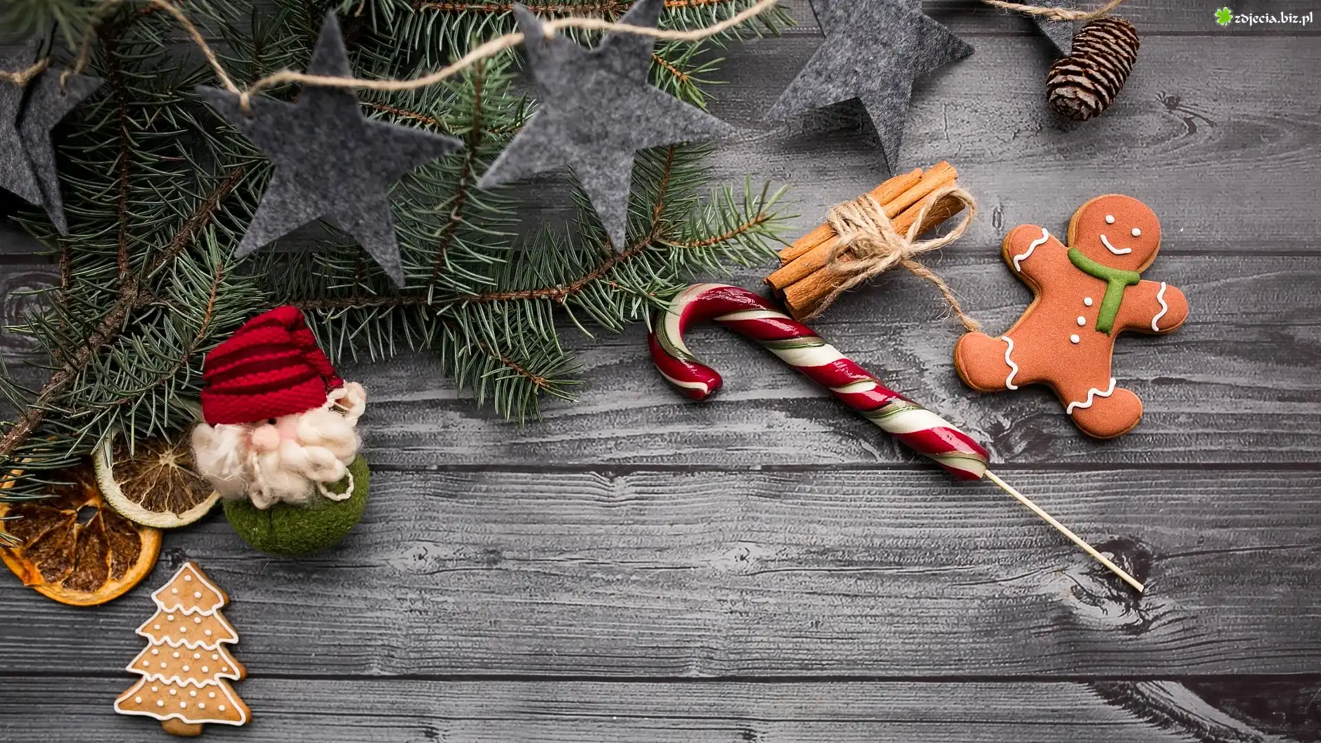 Zdjęcie Gałązki, Gwiazdki, Szyszka, Ciasteczka, Lizak, Cynamon, Mikołaj, Deski