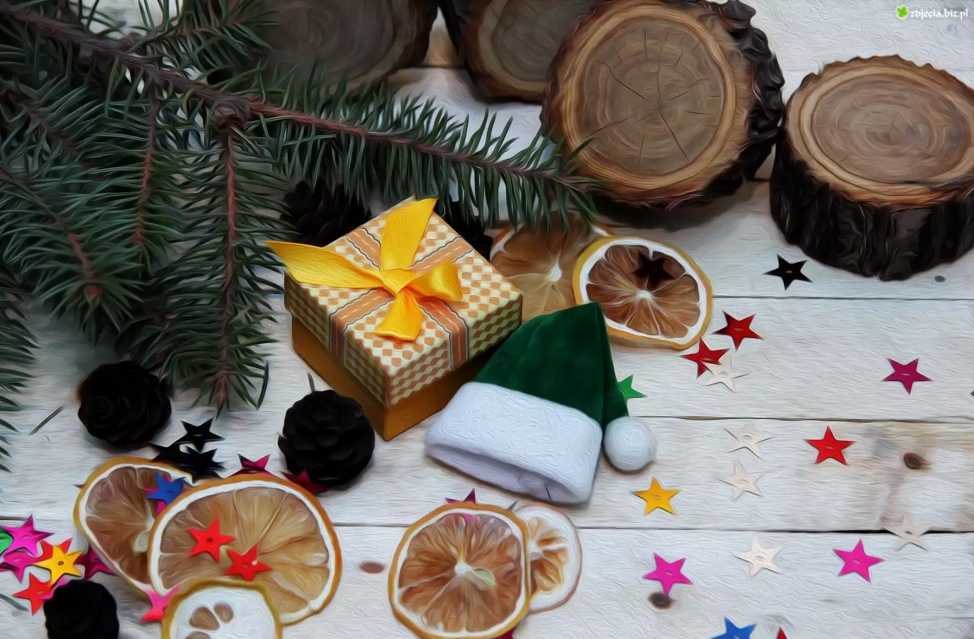 Zdjęcie Kompozycja, Świąteczna, Gałązka, Świerk, Prezent, Czapka, Pomarańcze, Pnie, Drzewa, Gwiazdki |