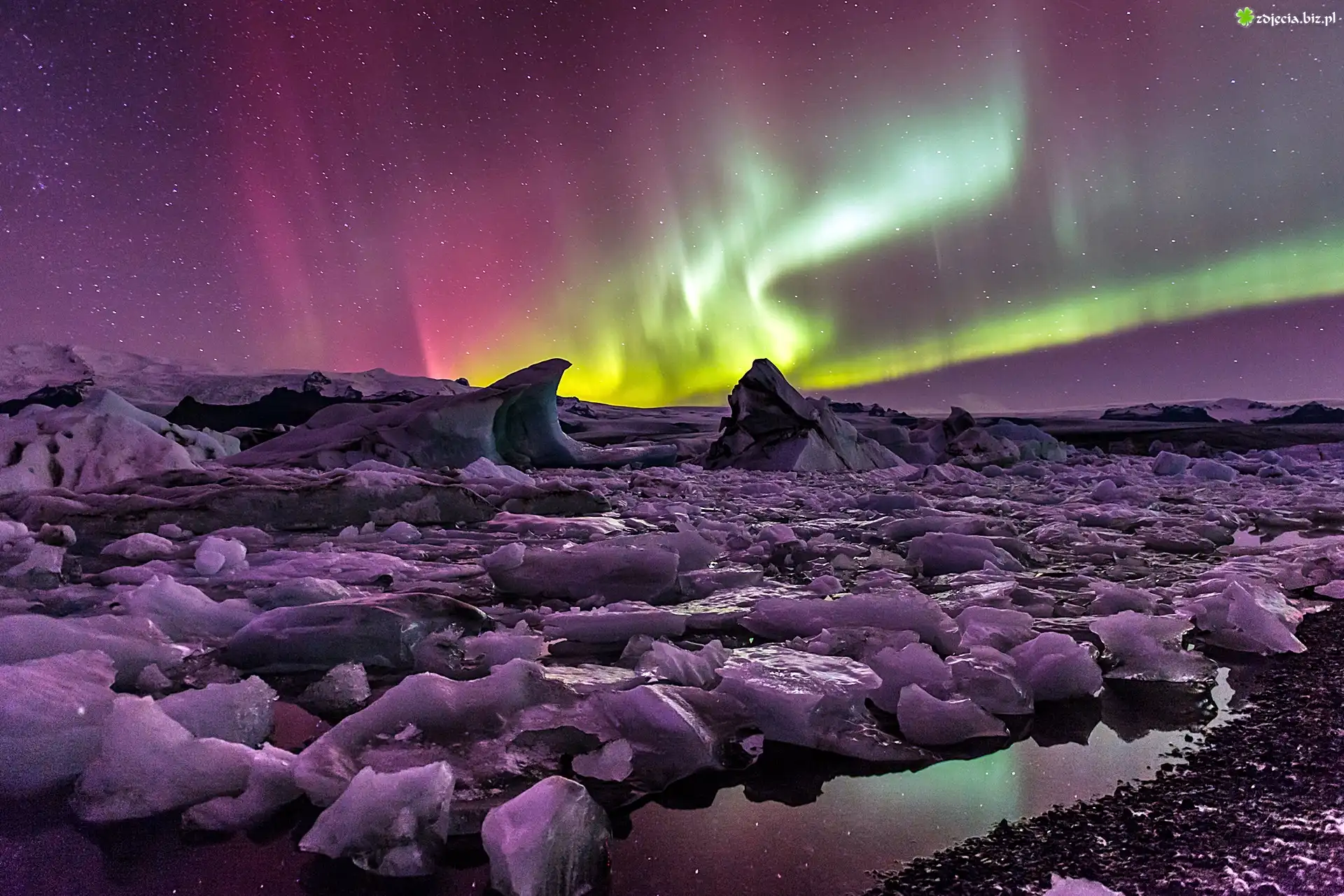 Zdjęcie Niebo, Gwiazdy, Zorza, Polarna, Morze, Kry, Lodowe