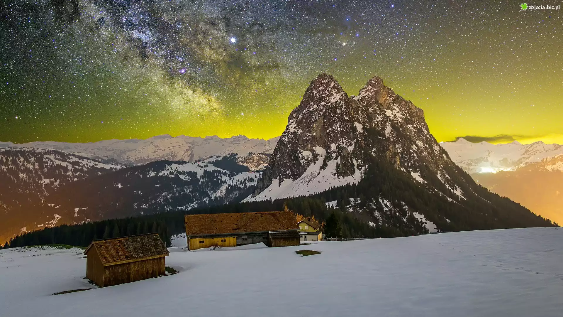 Zdjęcie Haggenegg, Domy, Szopy, Góry, Alpy, Góra Kleiner Mythen, Galaktyka, Droga Mleczna, Zima, Szwajcaria |