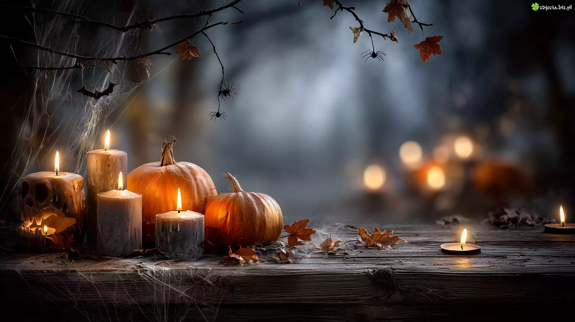 Zdjęcie Świece, Dynie, Pajęczyny, Halloween, Grafika AI