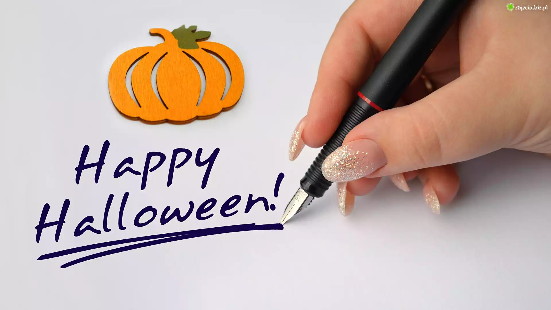 Zdjęcie Ręka, Pióro, Dynia, Napis, Życzenia, Halloween, Happy Halloween