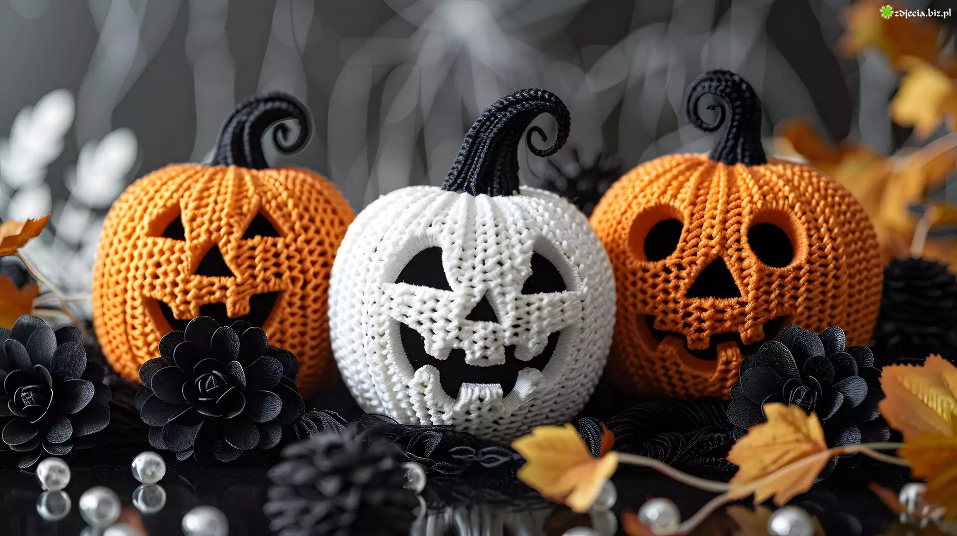 Zdjęcie Dynie, Kwiaty, Liście, Halloween