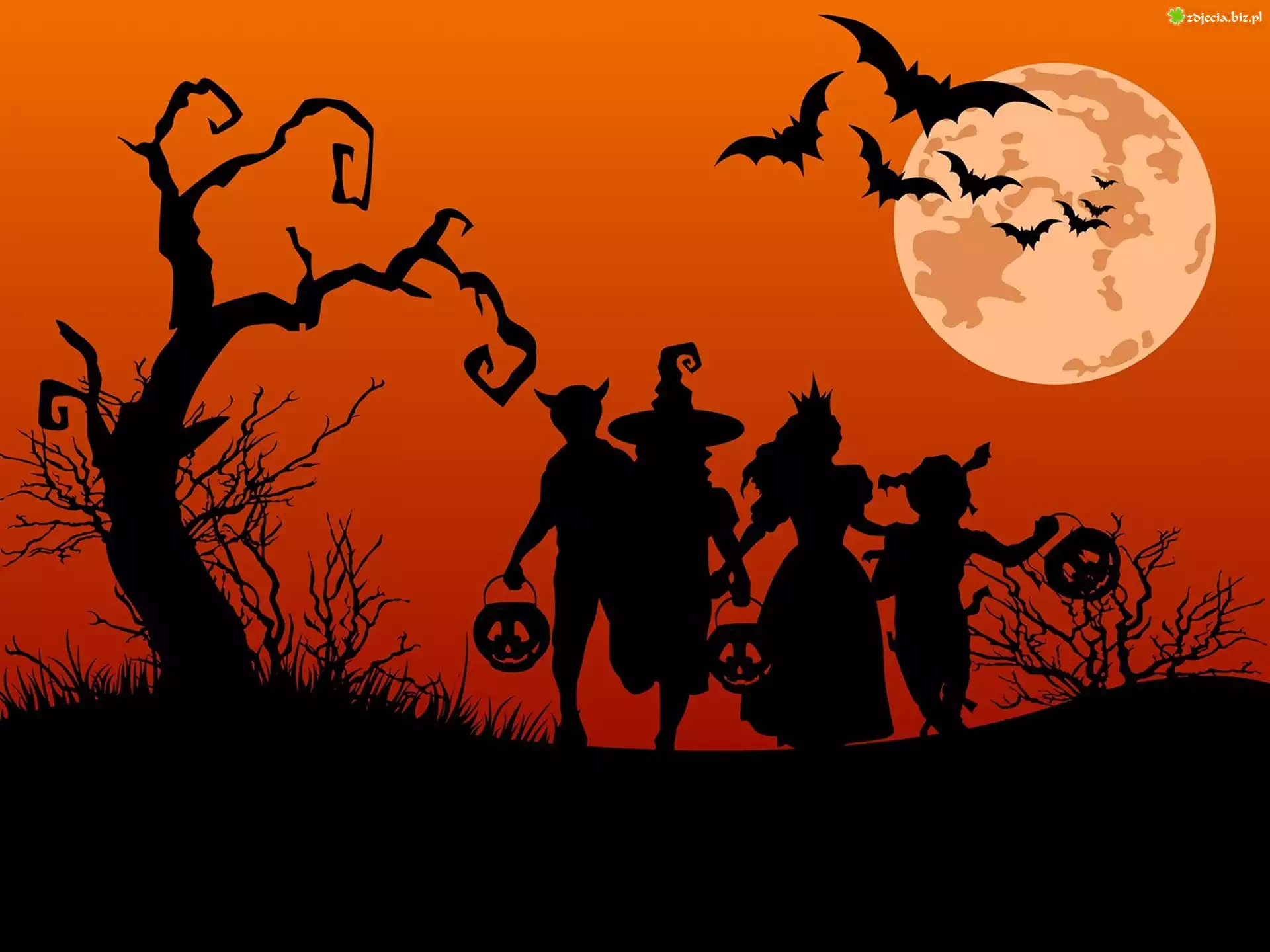 Zdjęcie Halloween, Drzewo, Postacie, Dynie, Księżyc, Nietoperze