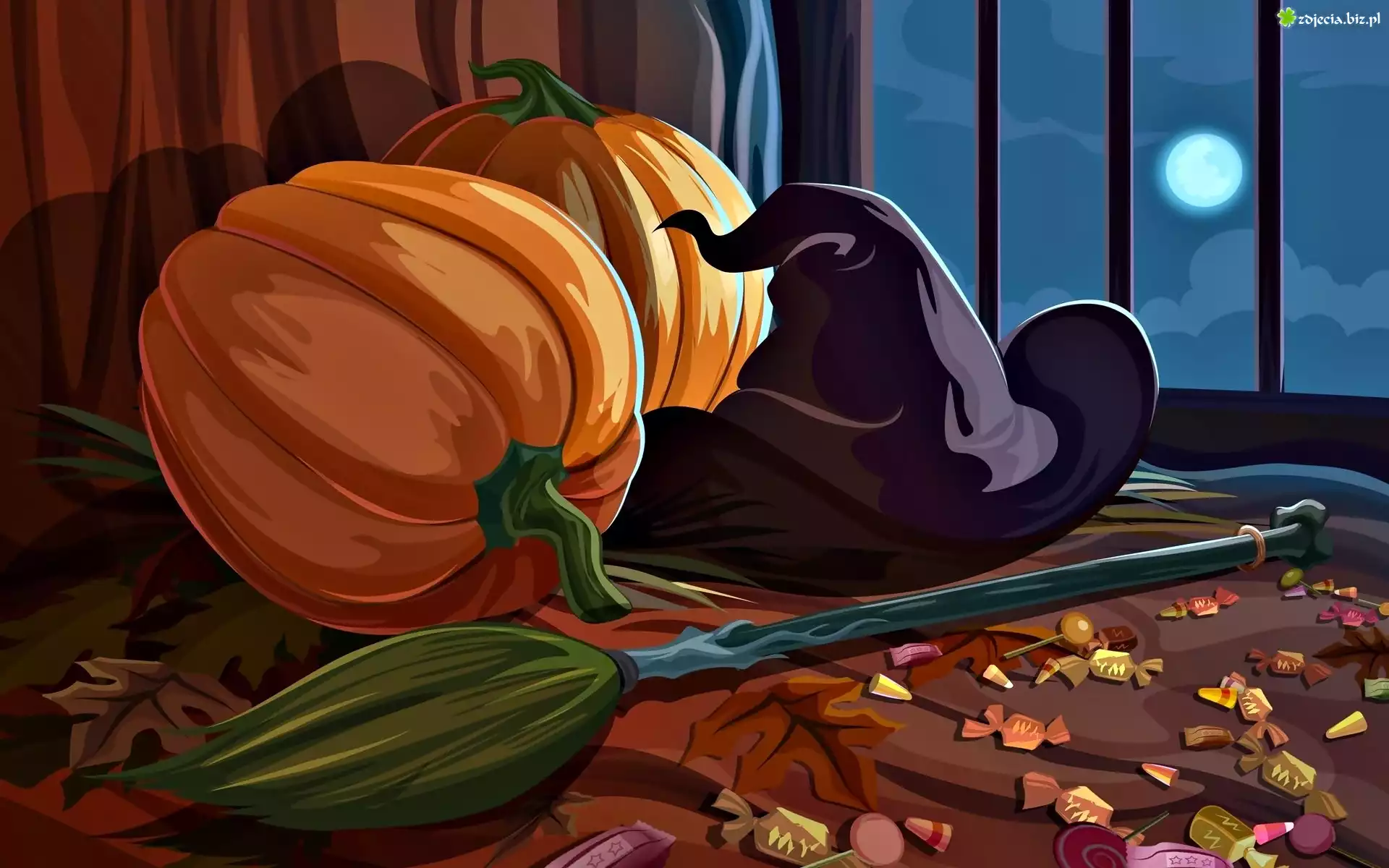 Zdjęcie Halloween, Dynia, Miotła, Kapelusz