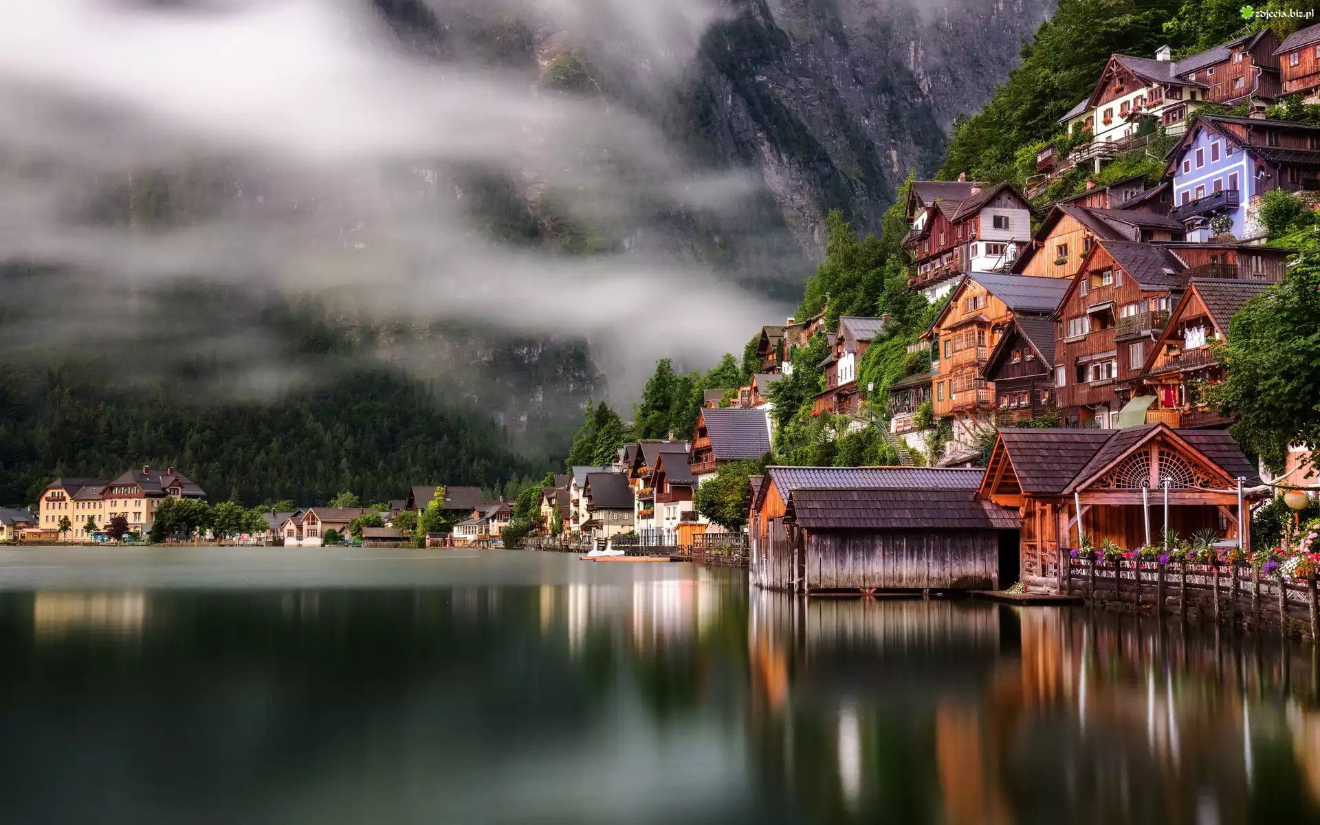 Zdjęcie, Austria, Hallstatt, Jezioro Hallstättersee, Domy, Góry, Mgła