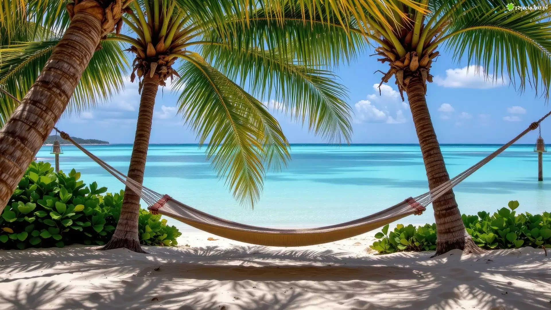 Zdjęcie Trzy, Palmy, Morze, Hamak, Rośliny, Piasek