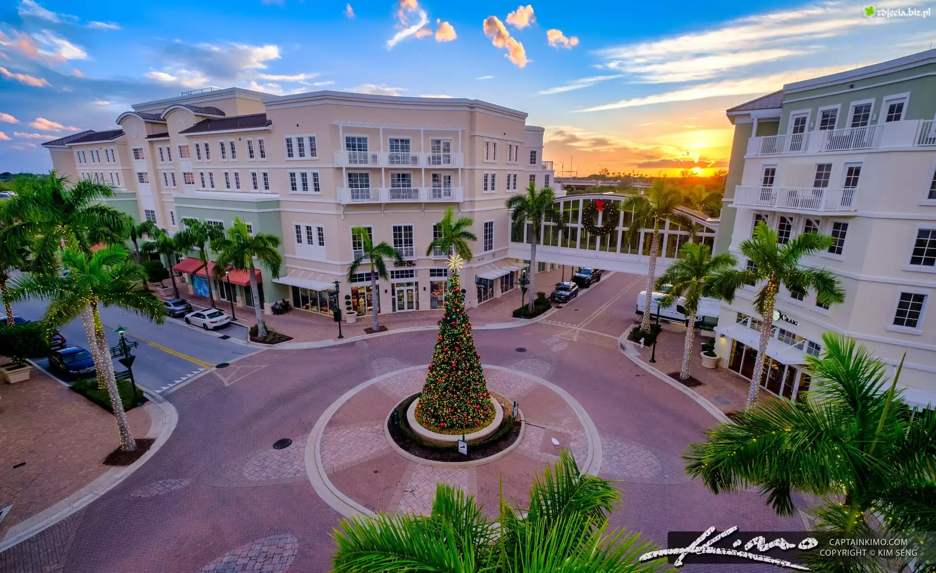 Zdjęcie Stany Zjednoczone, Floryda, Harbourside Place, Miasto, Choinka, Święta, Domy, Palmy, Ulice, Wschód słońca |