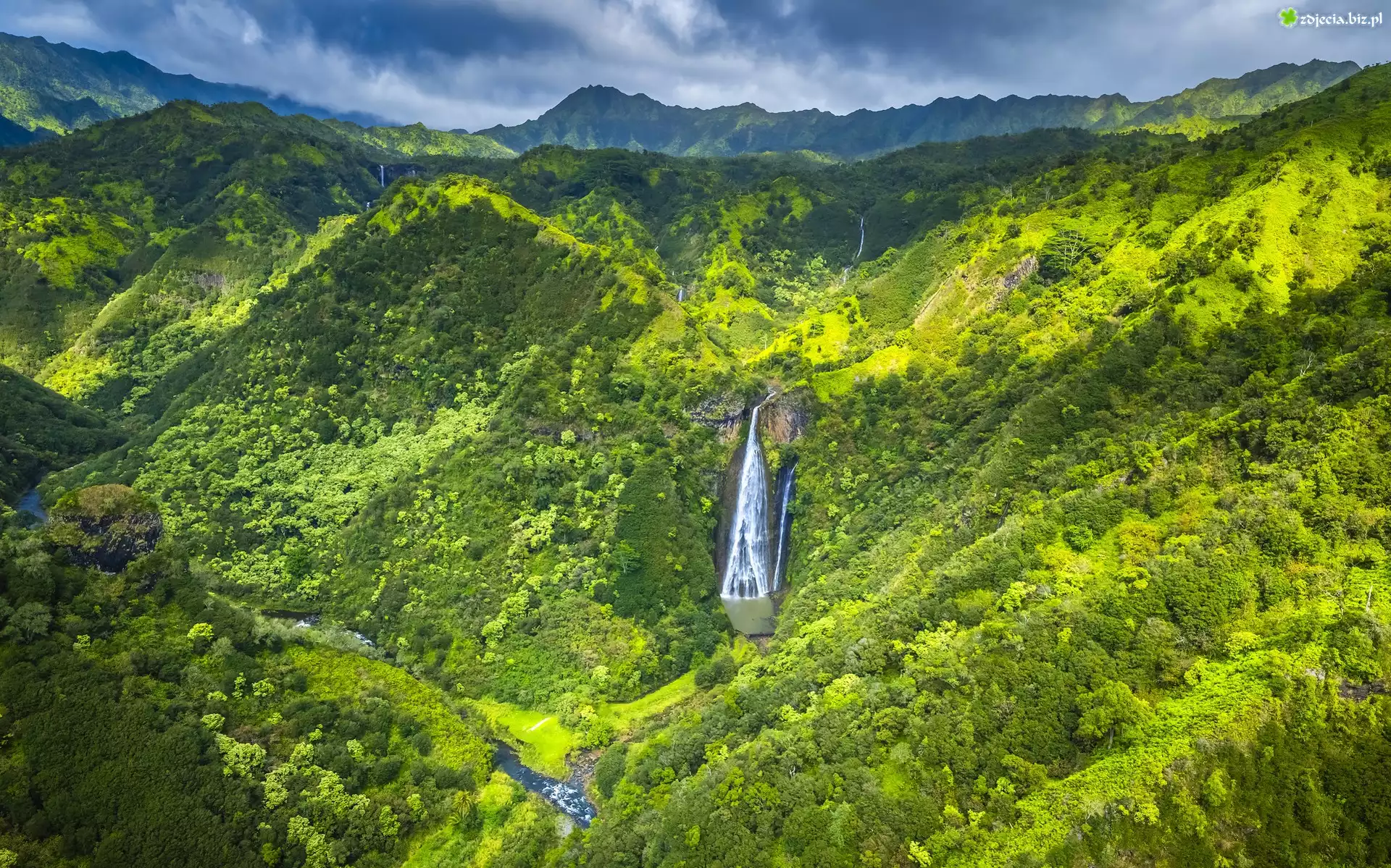 Zdjęcie Góry, Las, Drzewa, Wodospad, Jurassic Falls, Rzeka, Chmury, Napali Coast, Na Pali Coast State Wilderness Park, Hawaje, Stany Zjednoczone |
