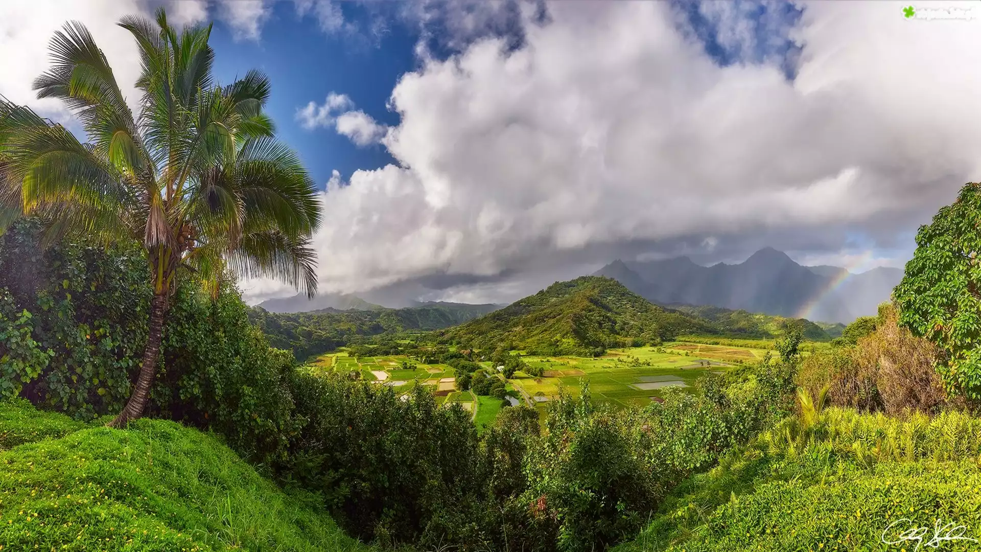 Zdjęcie Stany Zjednoczone, Hawaje, Wyspa Kauai, Góry, Wzgórza, Palmy, Roślinność, Chmury, Tęcza