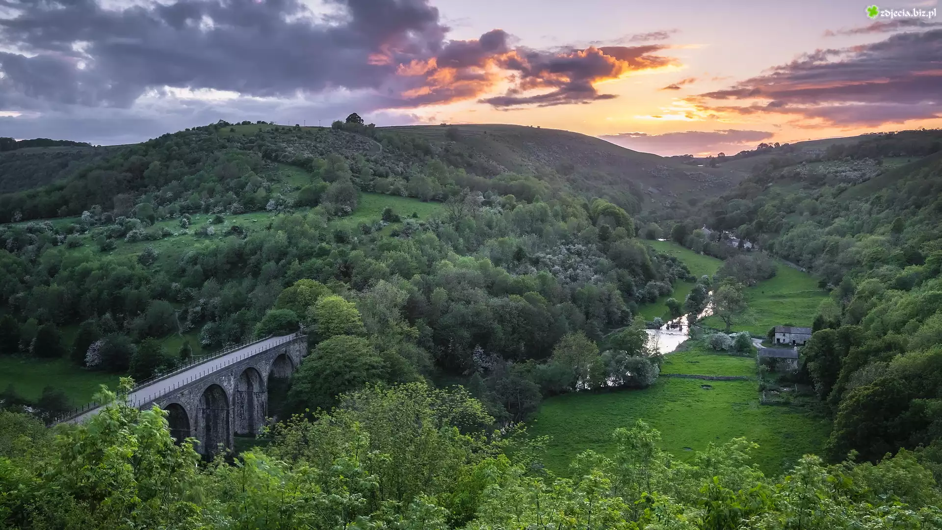 Zdjęcie, Dolina, Monsal Dale, Wzgórza, Most, Headstone Viaduct, Park Narodowy Peak District, Anglia