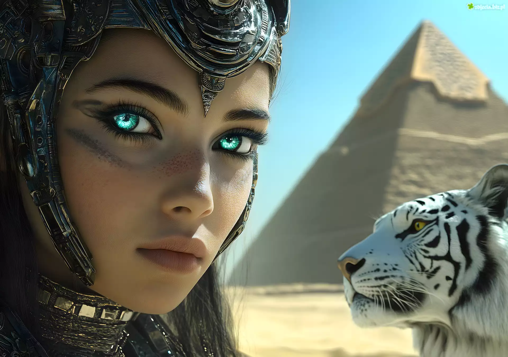 Zdjęcie Kobieta, Hełm, Tygrys, Piramidy, Grafika