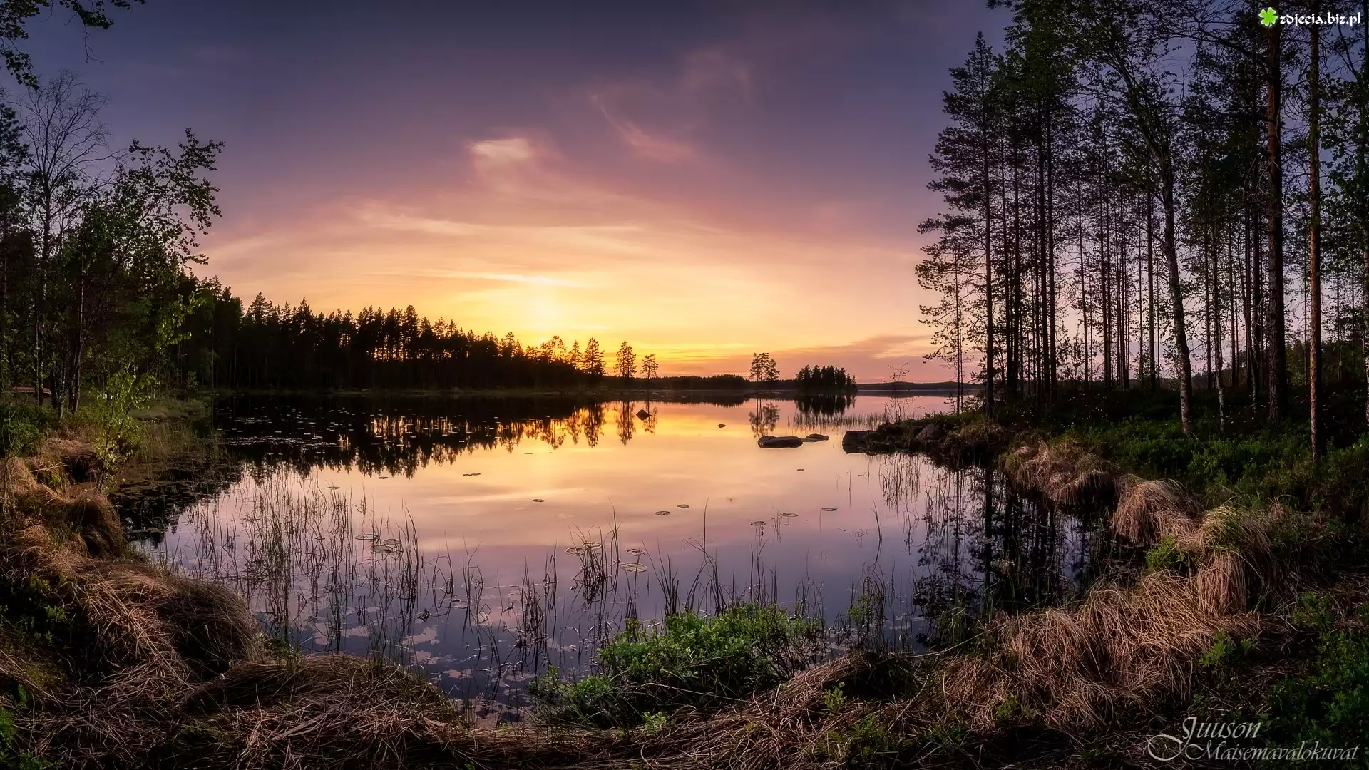 Zdjęcie Park Narodowy Helvetinjarvi, Jezioro Haukkajarvi, Drzewa, Zachód słońca, Gmina Ruovesi, Finlandia |