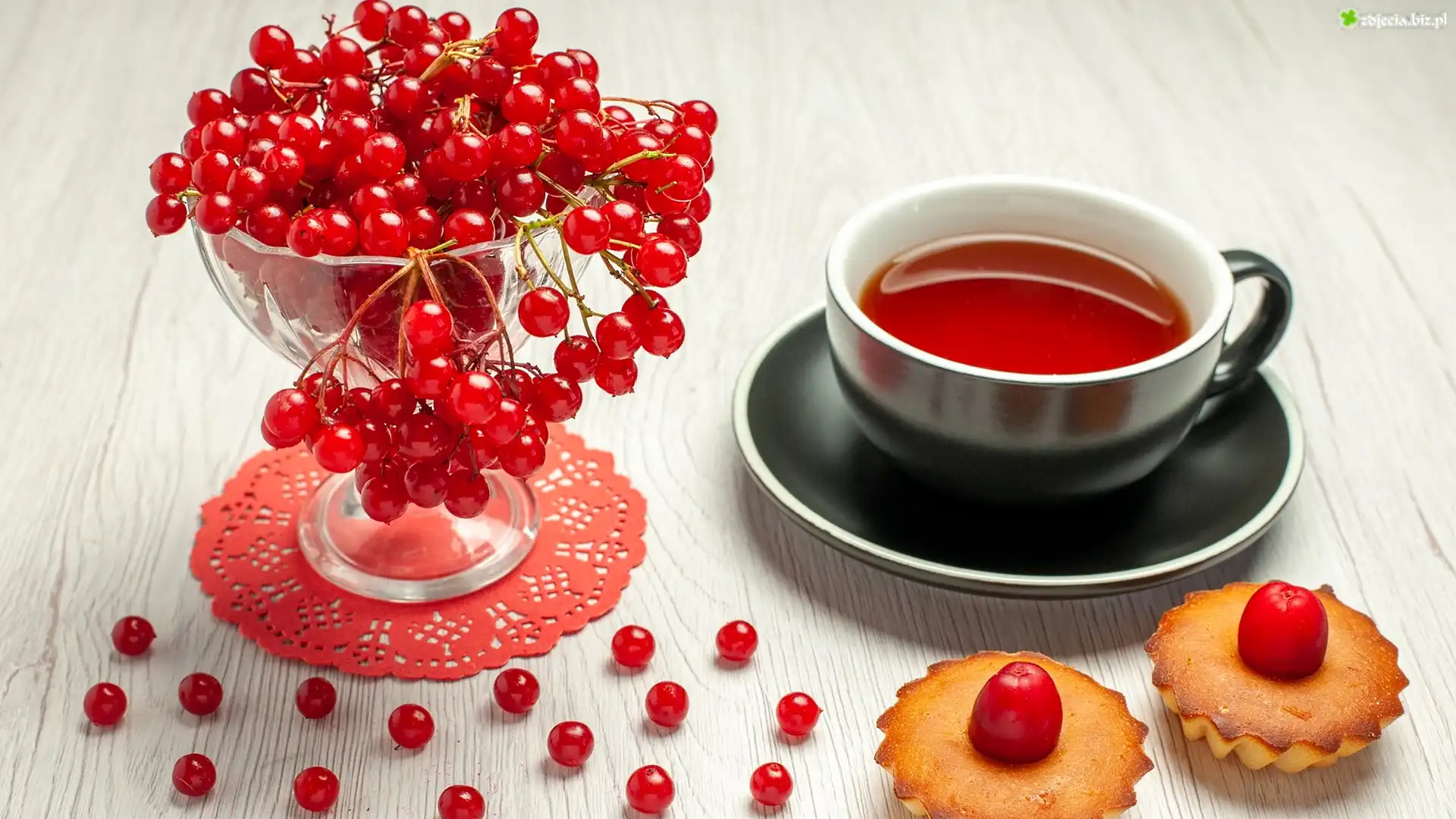 Zdjęcie Herbata, Filiżanka, Babeczki, Salaterka, Czerwona porzeczka