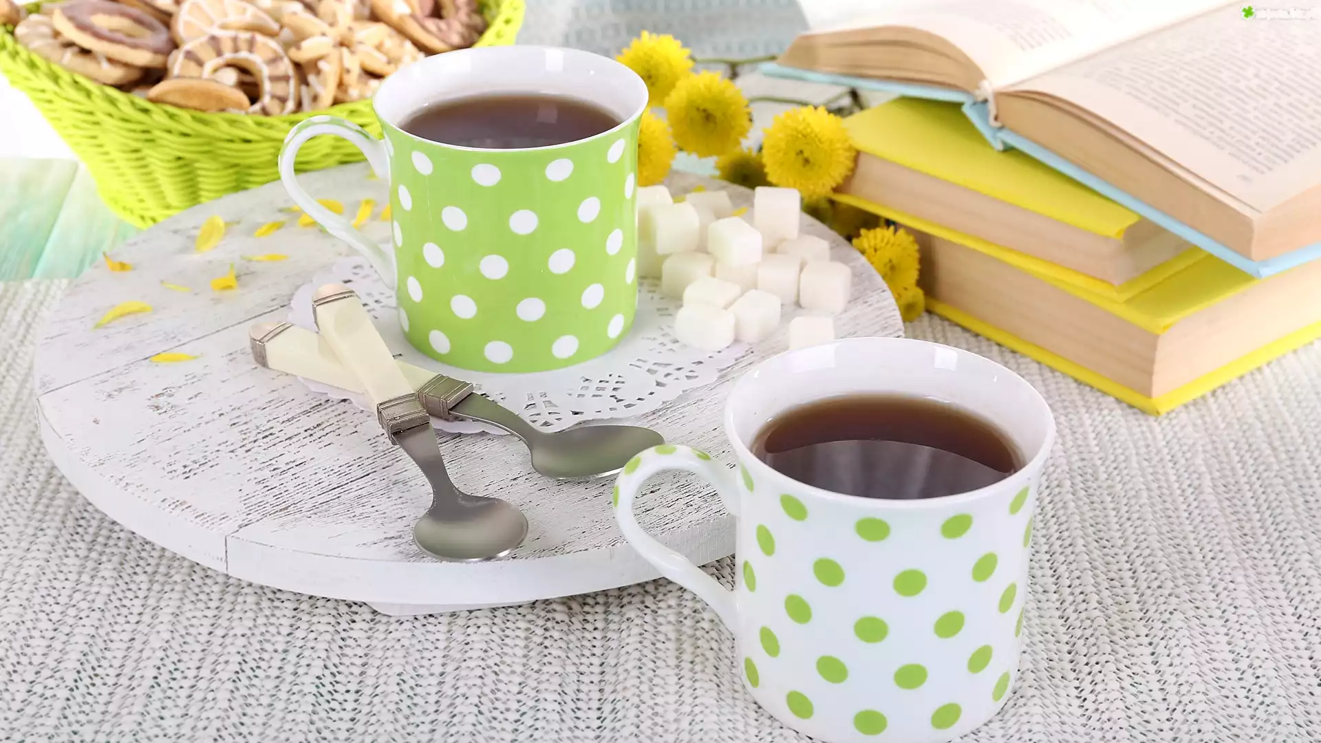 Zdjęcie, Herbata, Kubki, Cukier, Ciasteczka, Koszyk, Książki