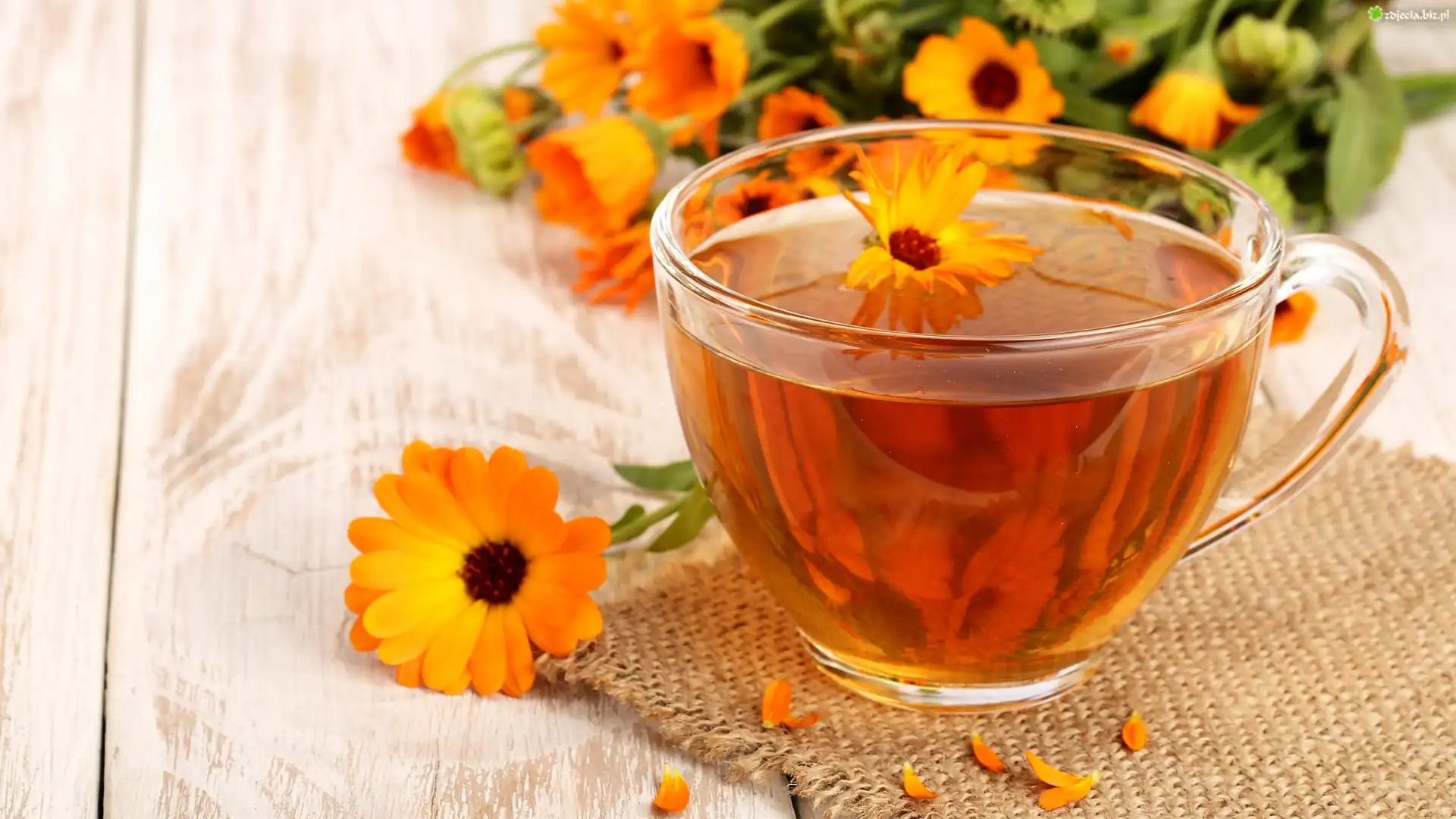 Zdjęcie Herbata, Filiżanka, Kwiat, Nagietek, Serwetka, Deski