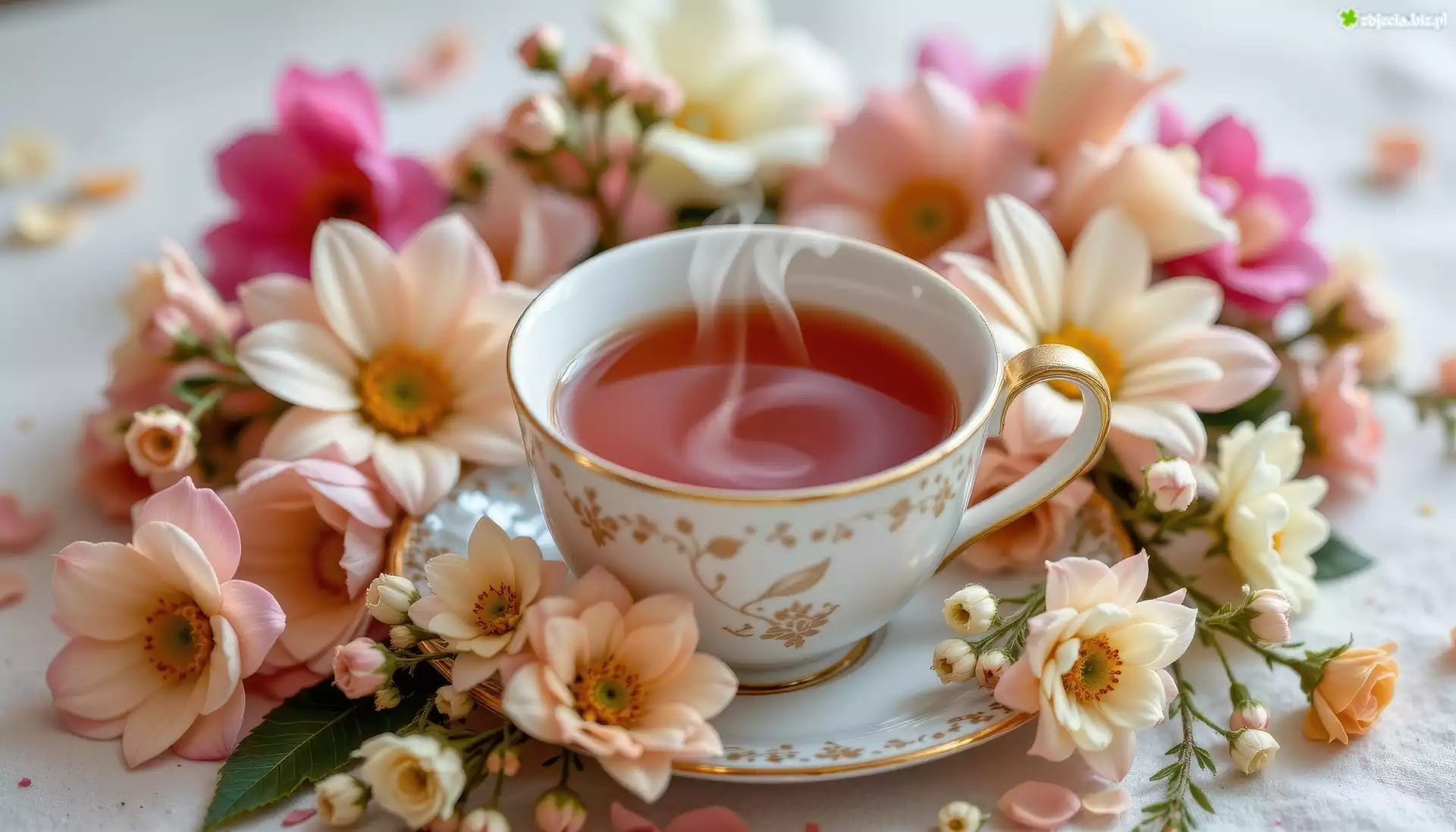 Zdjęcie Filiżanka, Herbata, Talerzyk, Kolorowe, Kwiaty