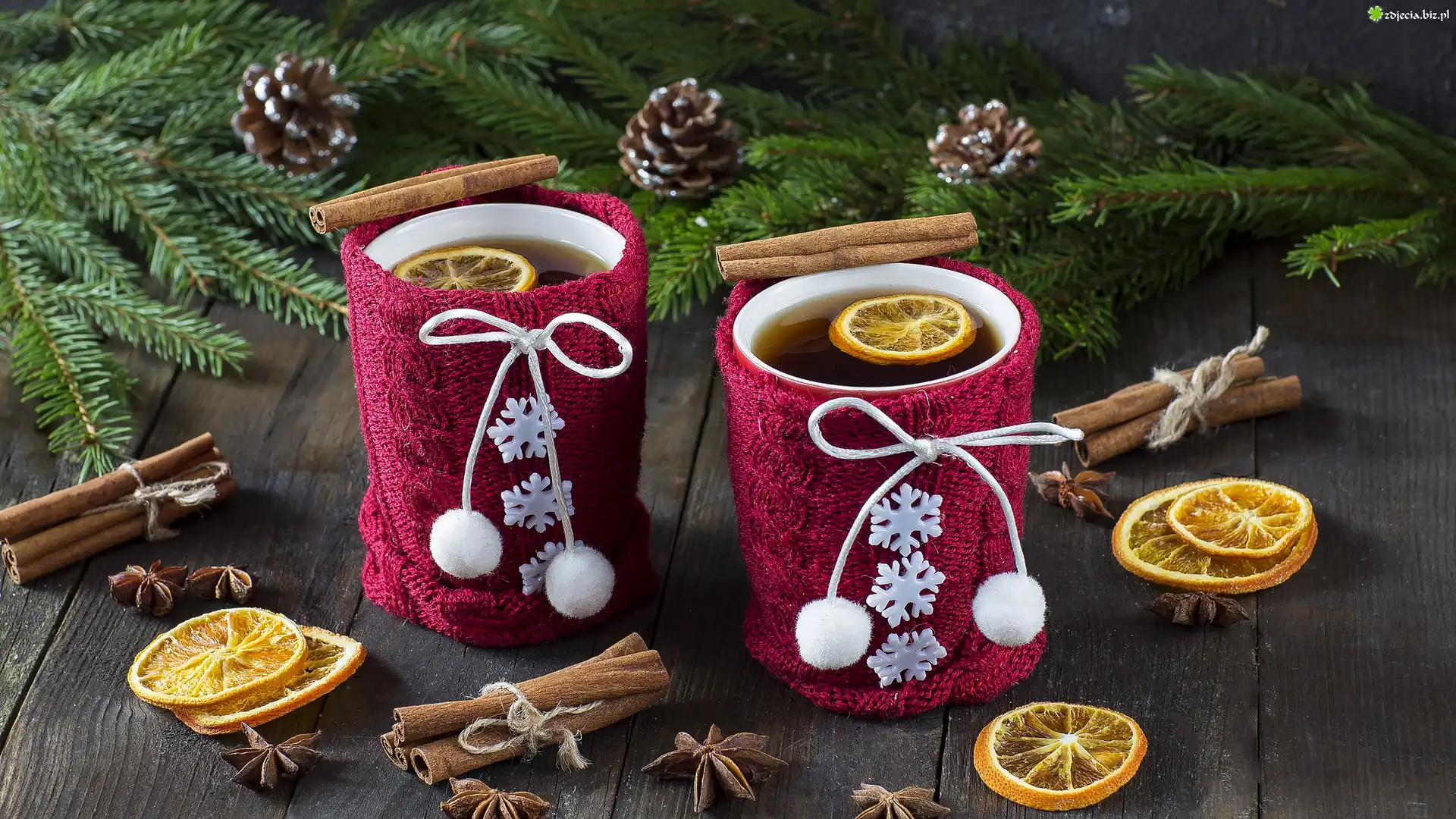 Zdjęcie Herbata, Dwa, Kubki, Sweterek, Ozdoba, Cytryna, Pomarańcz, Plastry, Anyż, Cynamon, Gałązki, Szyszki, Deski, Świąteczne, Kompozycja |