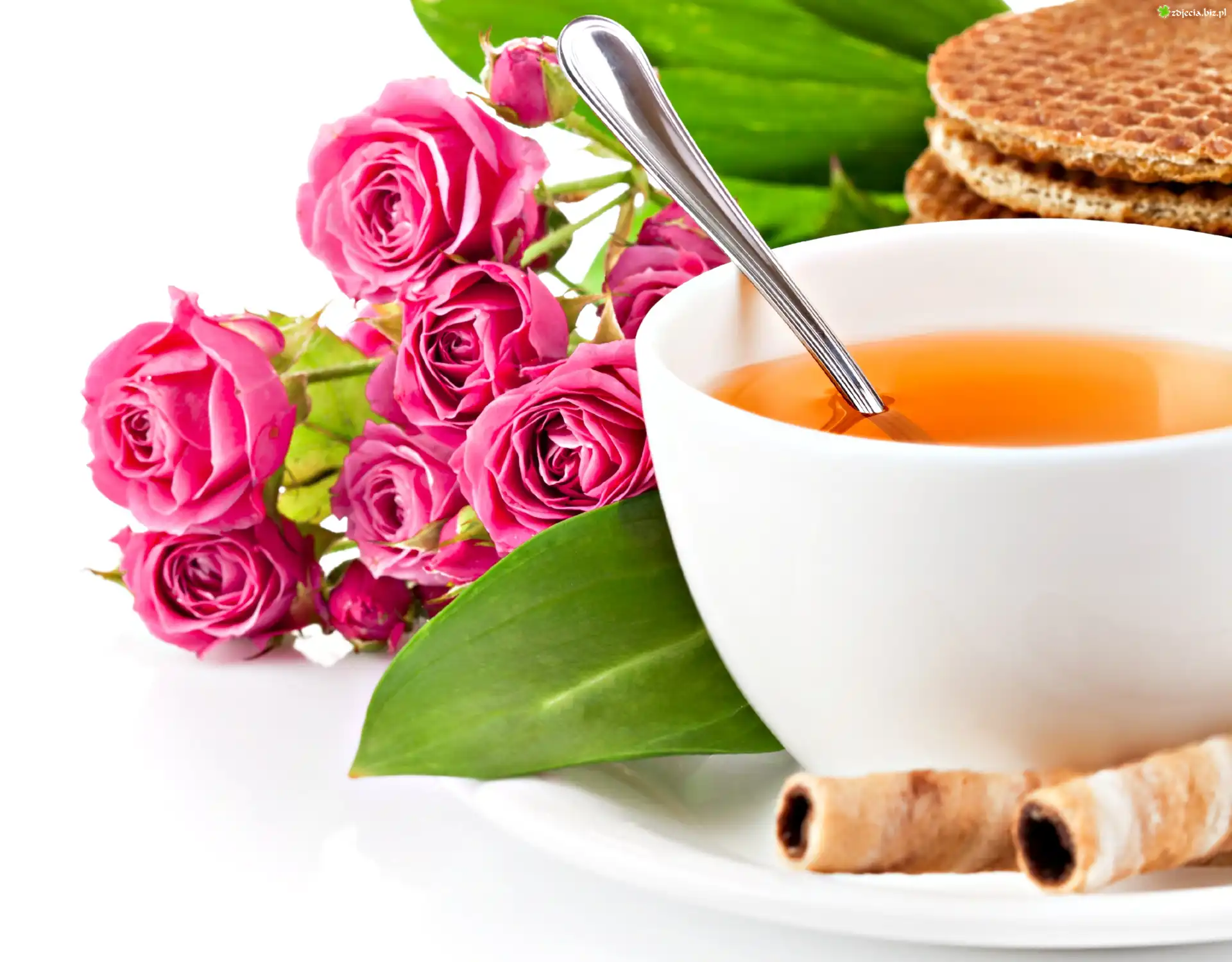 Zdjęcie Herbatka, Ciasteczka, Róże, Śniadanie