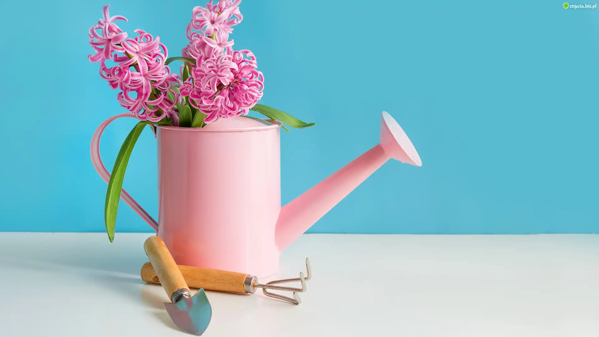 Zdjęcie Różowe, Hiacynty, Konewka, Grabki, Łopatka, Niebieskie, Tło