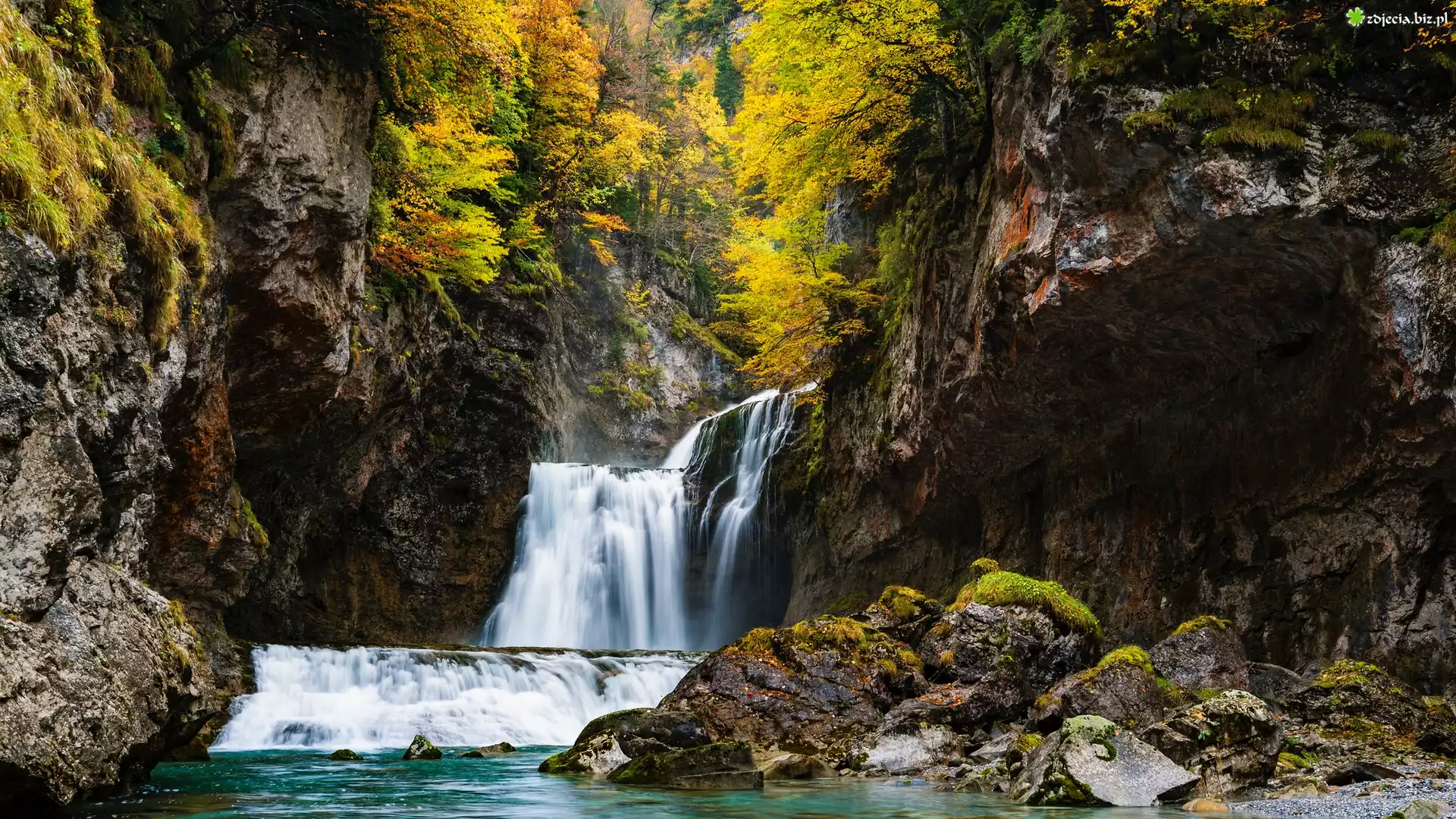 Zdjęcie Hiszpania, Aragonia, Pireneje, Wodospad, Rzeka, Río Arazas, Rezerwat przyrody, Cascada de la Cueva, Skały, Kamienie, Drzewa, Jesień |