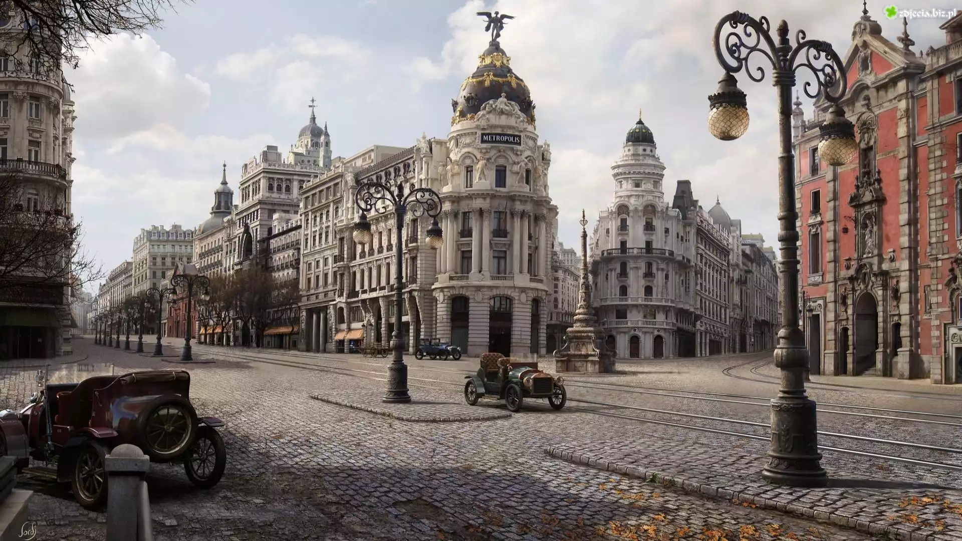 Zdjęcie Hiszpania, Madryt, Biurowiec Metropolis, Ulica Gran Via, Rok 1900, Kamienice, Zabytkowe, Samochody, Latarnie, Matte painting |