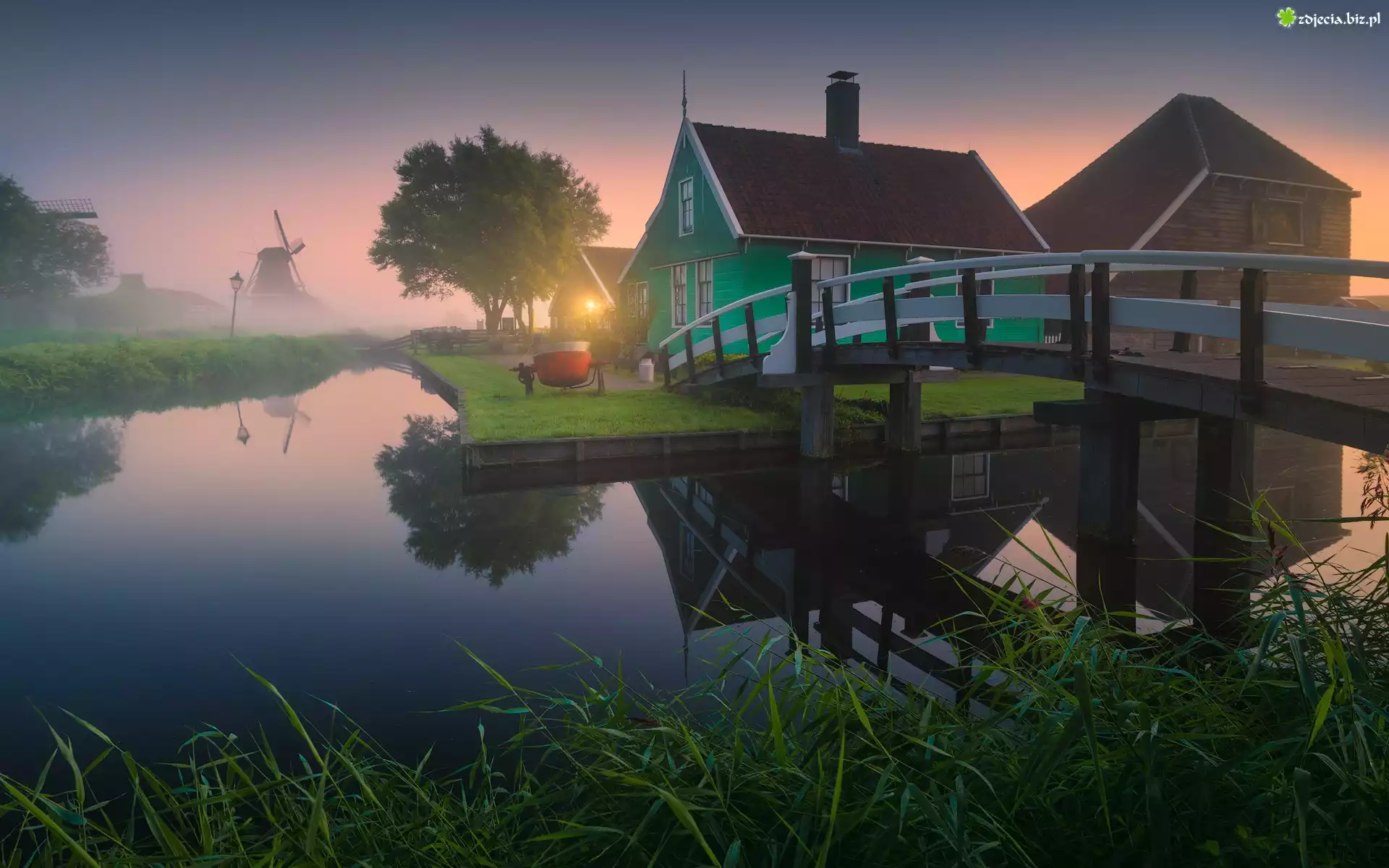 Zdjęcie Holandia, Skansen Zaanse Schans, Wiatraki, Domy, Most, Rzeka, Drzewa, Mgła