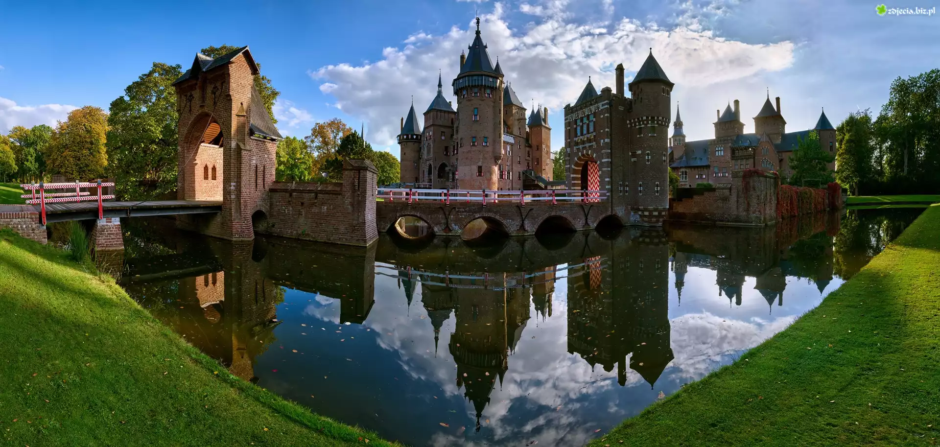 Zdjęcie Holandia, Haarzuilens, Zamek, Castle De Haar, Wieża, Most, Staw, Odbicie