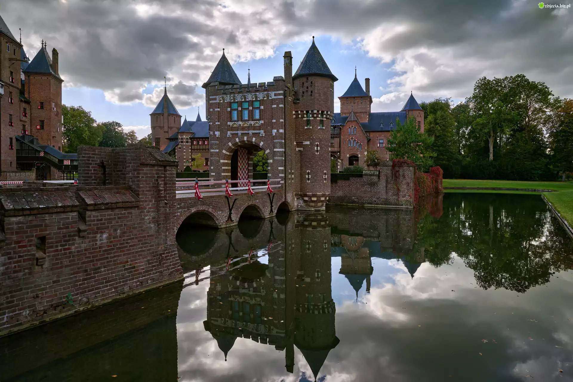 Zdjęcie Holandia, Utrecht, Zamek, Castle De Haar, Wieża, Most, Staw, Odbicie