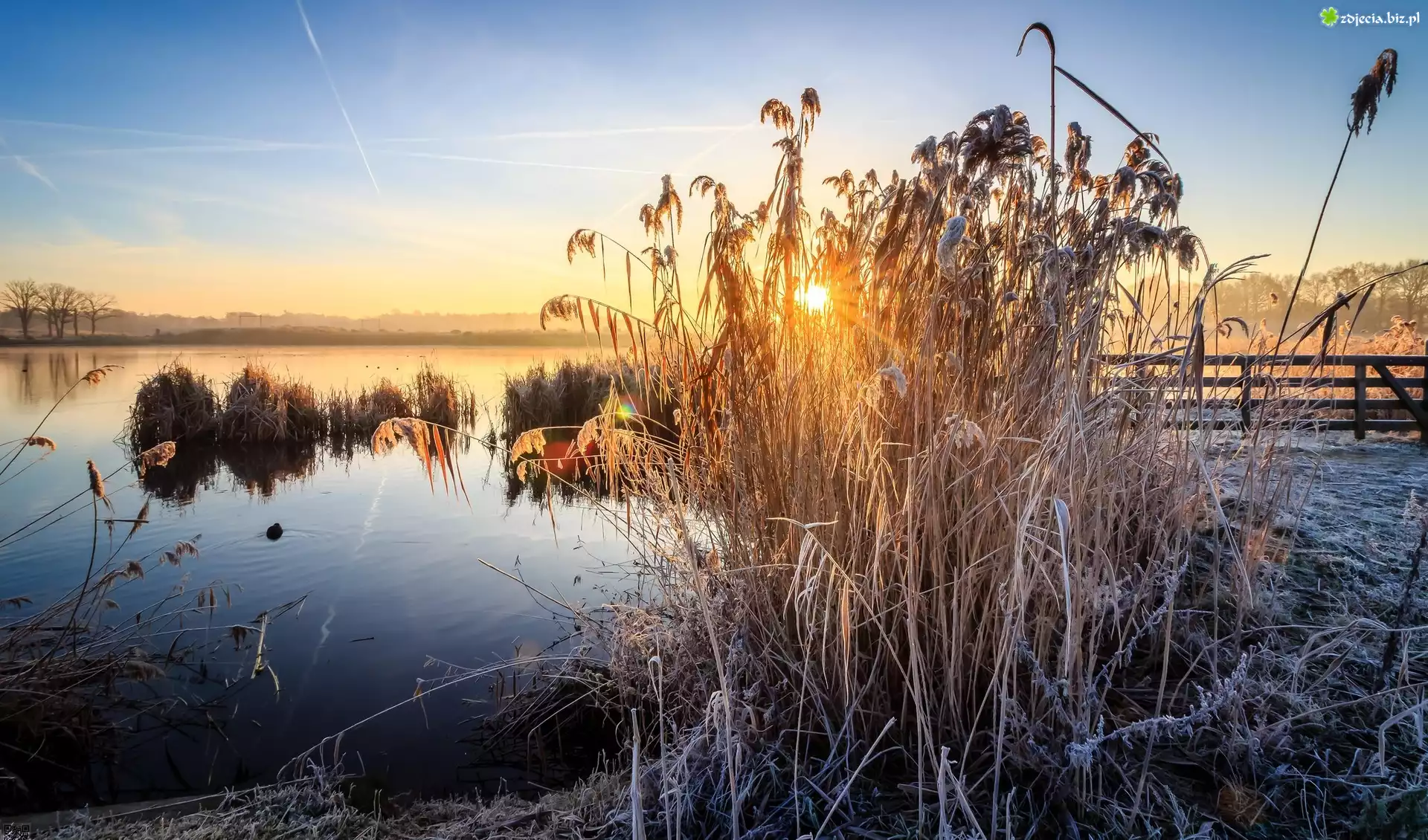 Zdjęcie Holandia, Prowincja Overijssel, Gmina Enschede, Rezerwat przyrody Kristalbad, Zbiornik wodny, Jezioro, Trawy, Szron, Zachód słońca |
