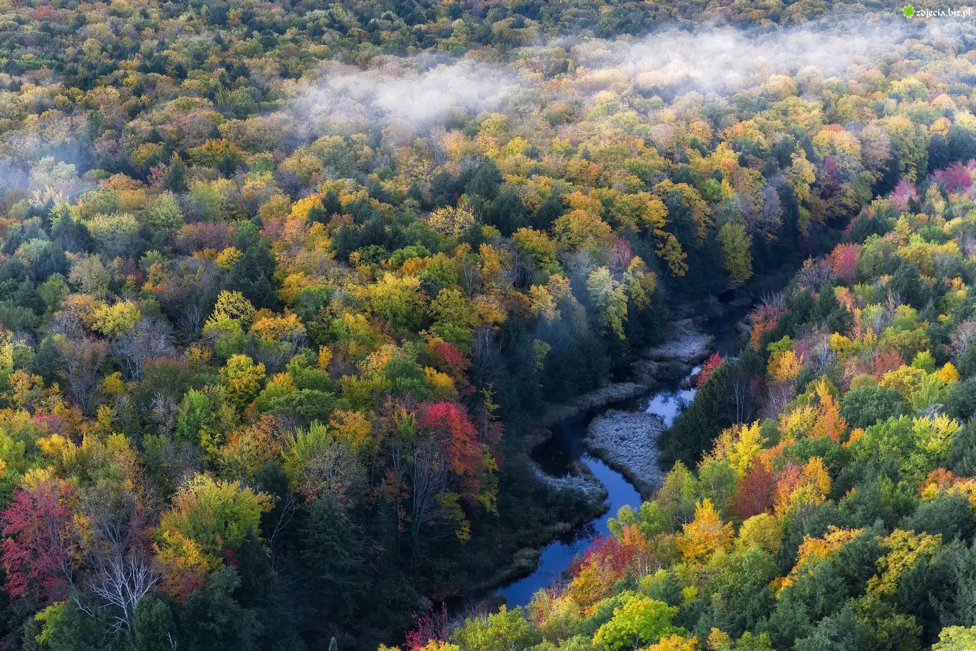 Zdjęcie Stany Zjednoczone, Stan Michigan, Hrabstwo Ontonagon, Rzeka Carp River, Jesień, Las, Drzewa, Rzeka, Mgła |