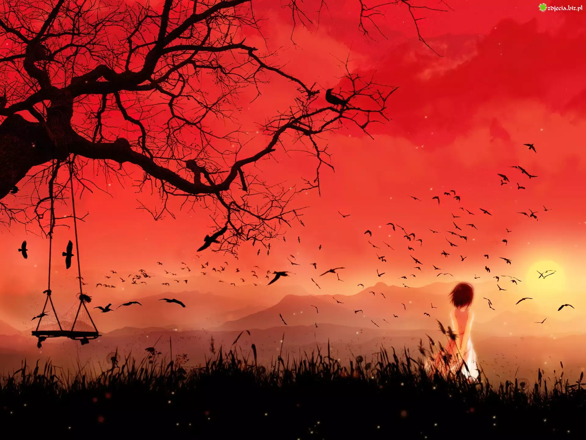 Zdjęcie Łąka, Drzewo, Huśtawka, Kobieta