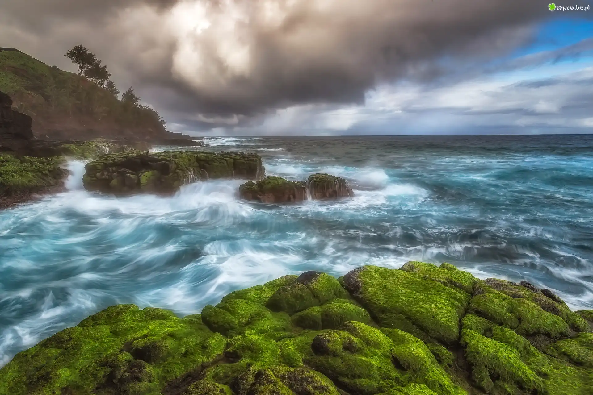 ZdjÄ™cie Hawaje, Wybrzeże, Wyspa Kauaʻi, Ocean Spokojny, Drzewa, Chmury, OmszaÅ‚e, SkaÅ‚y