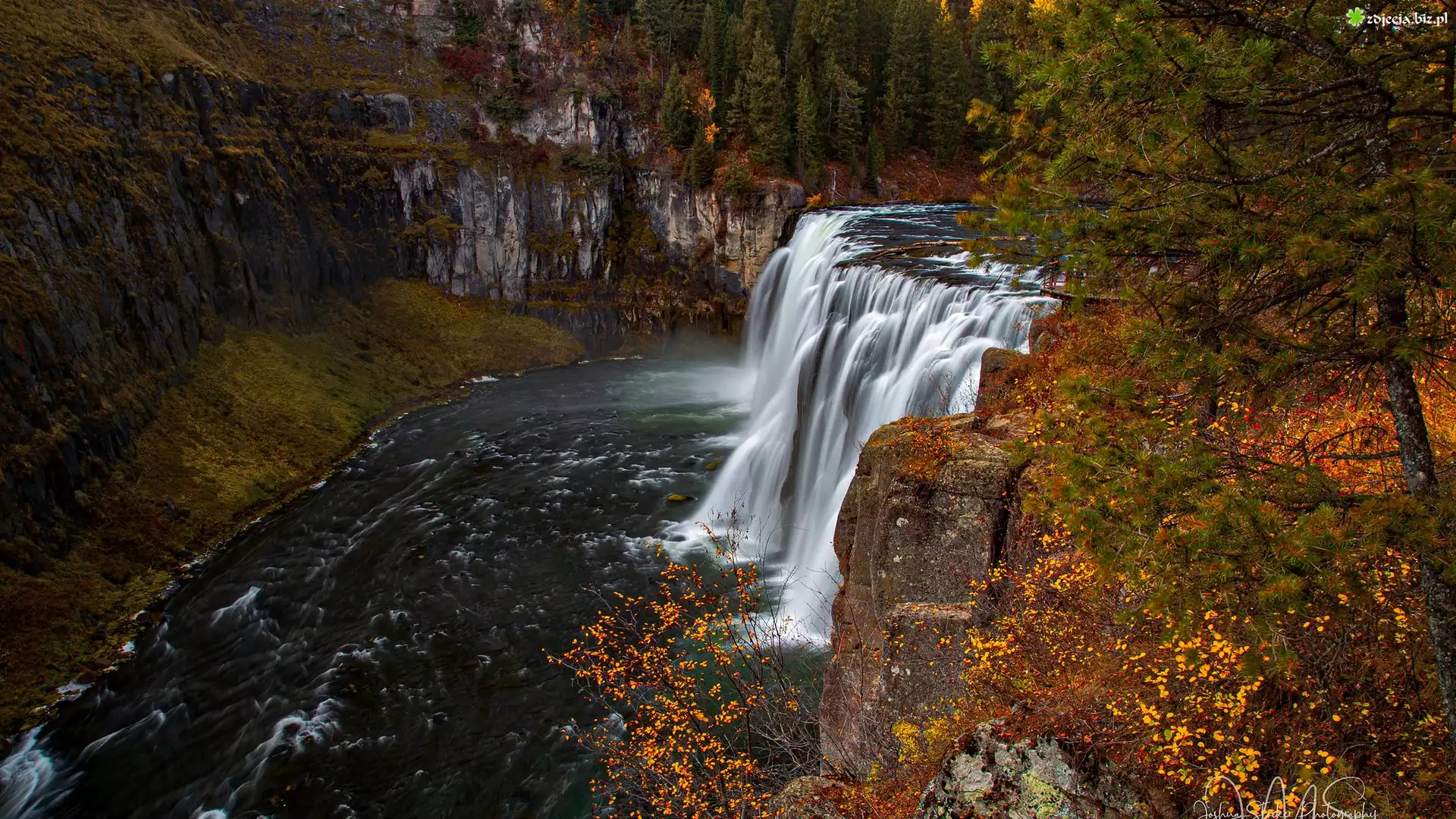 Zdjęcie, Jesień, Wodospad, Upper Mesa Falls, Las, Drzewa, Skały, Rzeka, Idaho, Stany Zjednoczone
