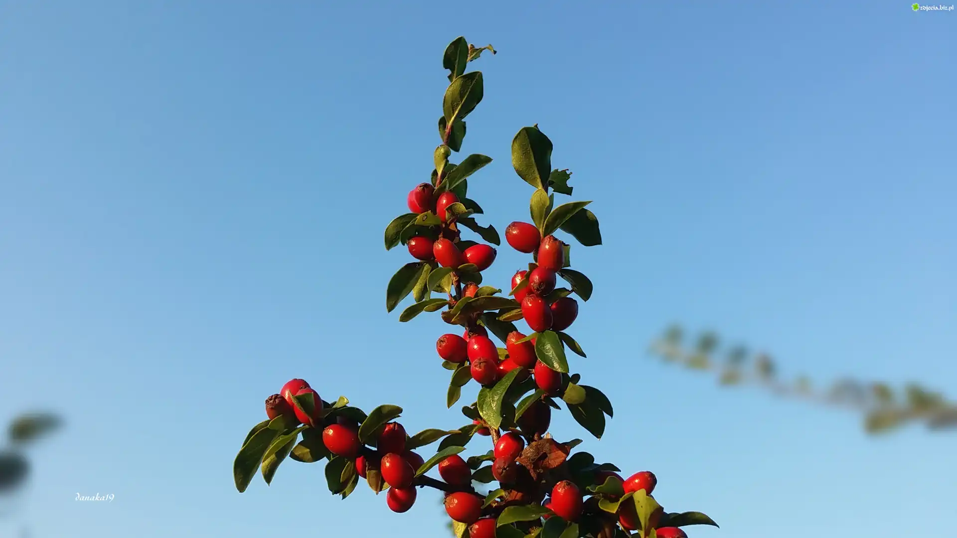 Zdjęcie Krzew, Irga, Gałązka, Czerwone, Jagody, Błękitne, Niebo, Lato