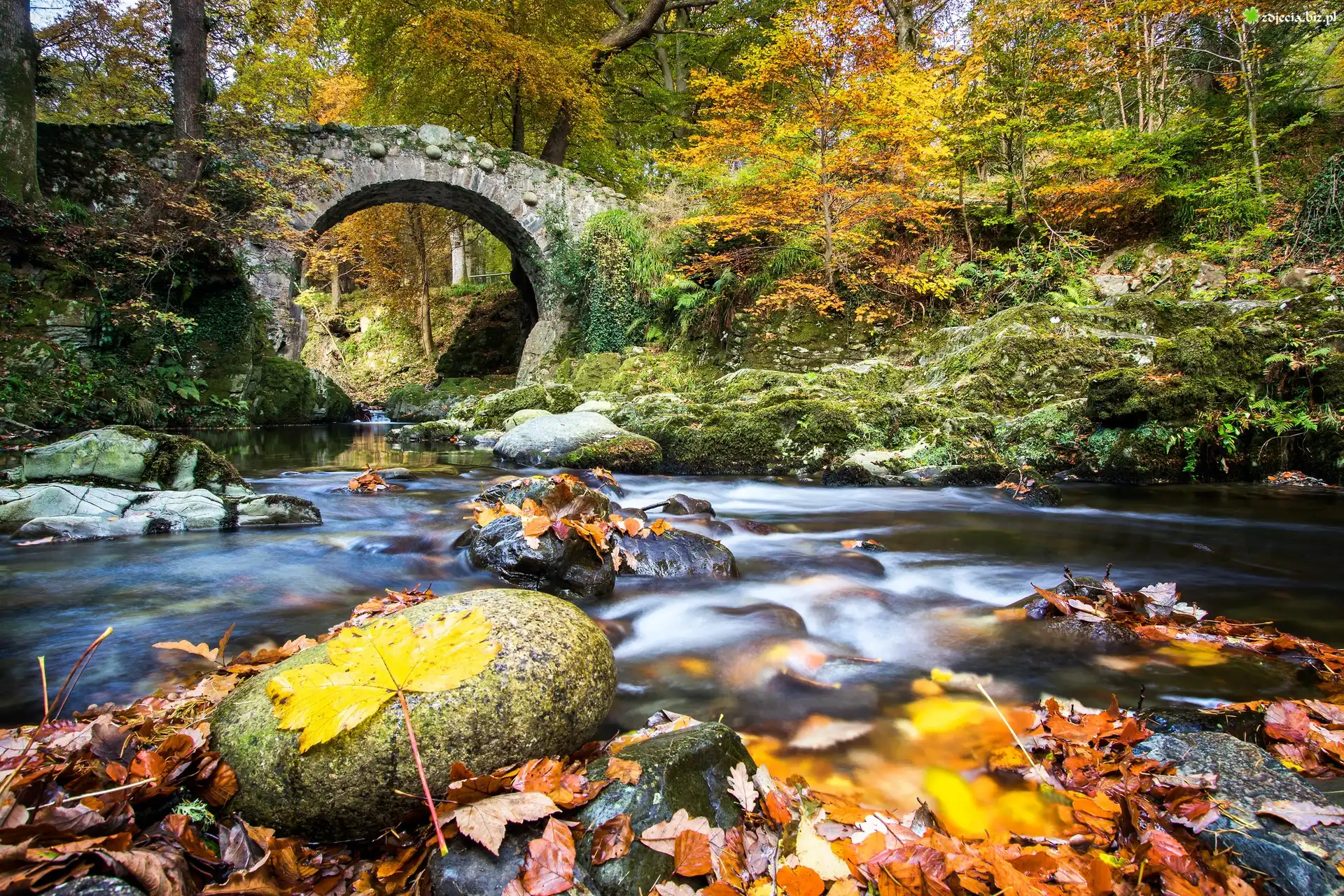 Zdjęcie Irlandia Północna, Park Tollymore Forest, Jesień, Las, Rzeka Shimna, Kamienny, Most, Kamienie, Liście |