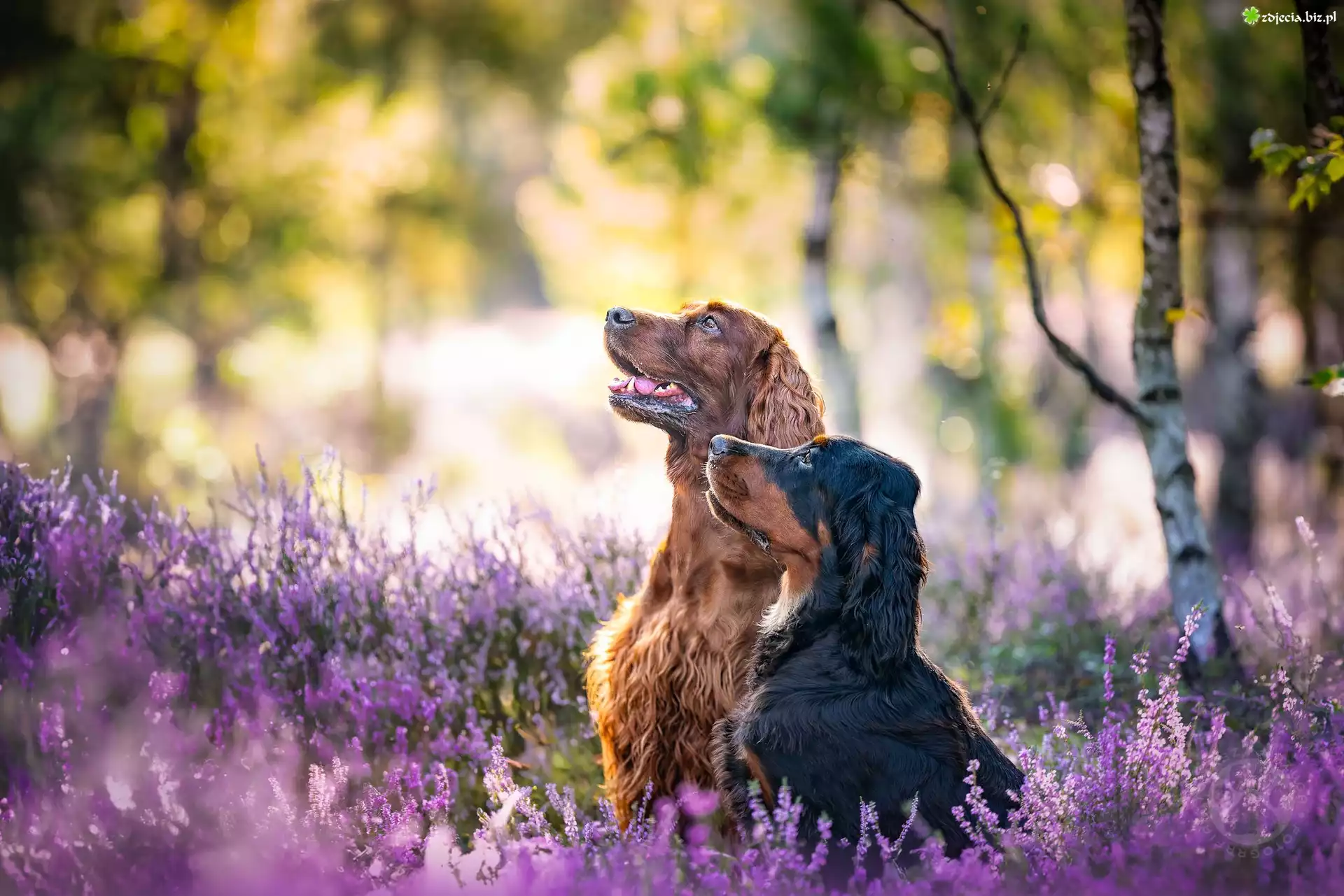Zdjęcie Dwa, Psy, Seter irlandzki, Seter szkocki, Wrzosy