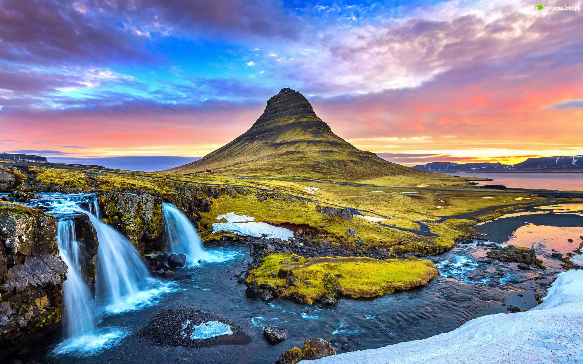 Zdjęcie, Góra Kirkjufell, Rzeka, Wodospad Kirkjufellsfoss, Zachód słońca, Islandia