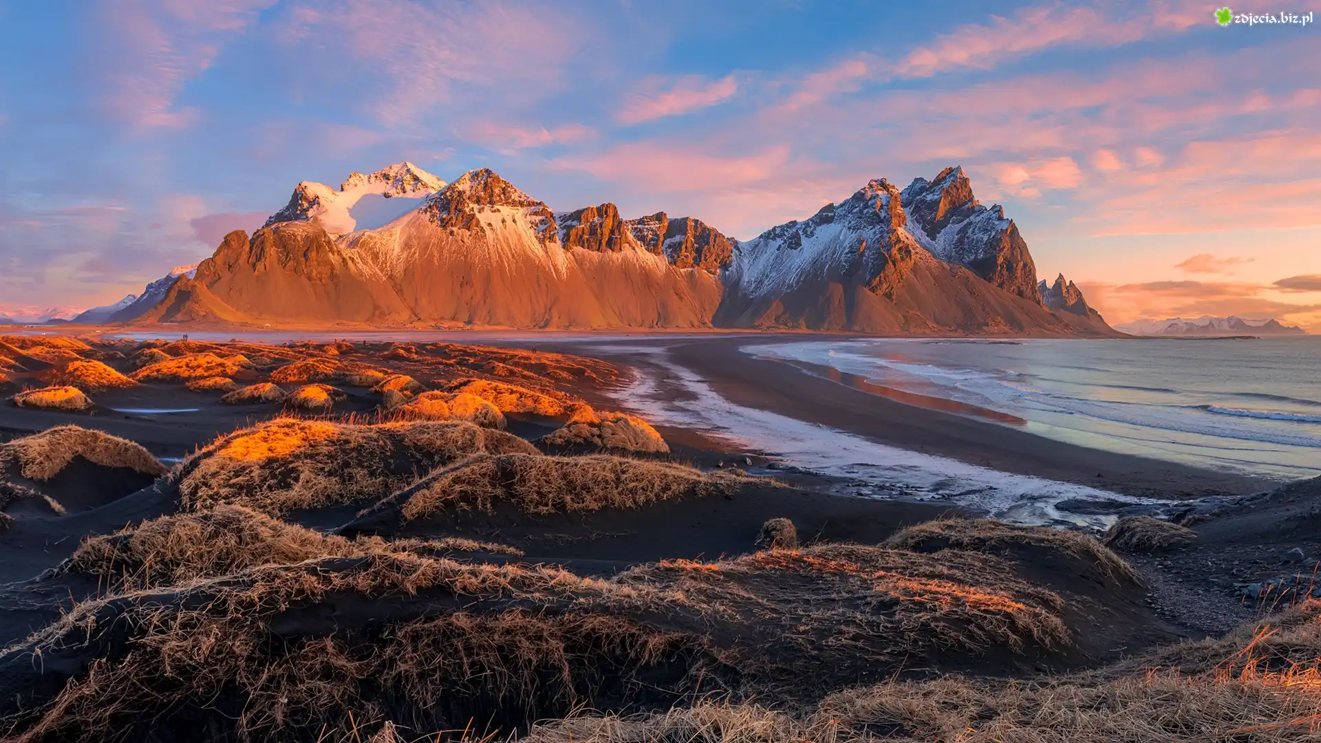 Zdjęcie Góry, Góra Vestrahorn, Plaża Stokksnes, Trawa, Chmury, Islandia