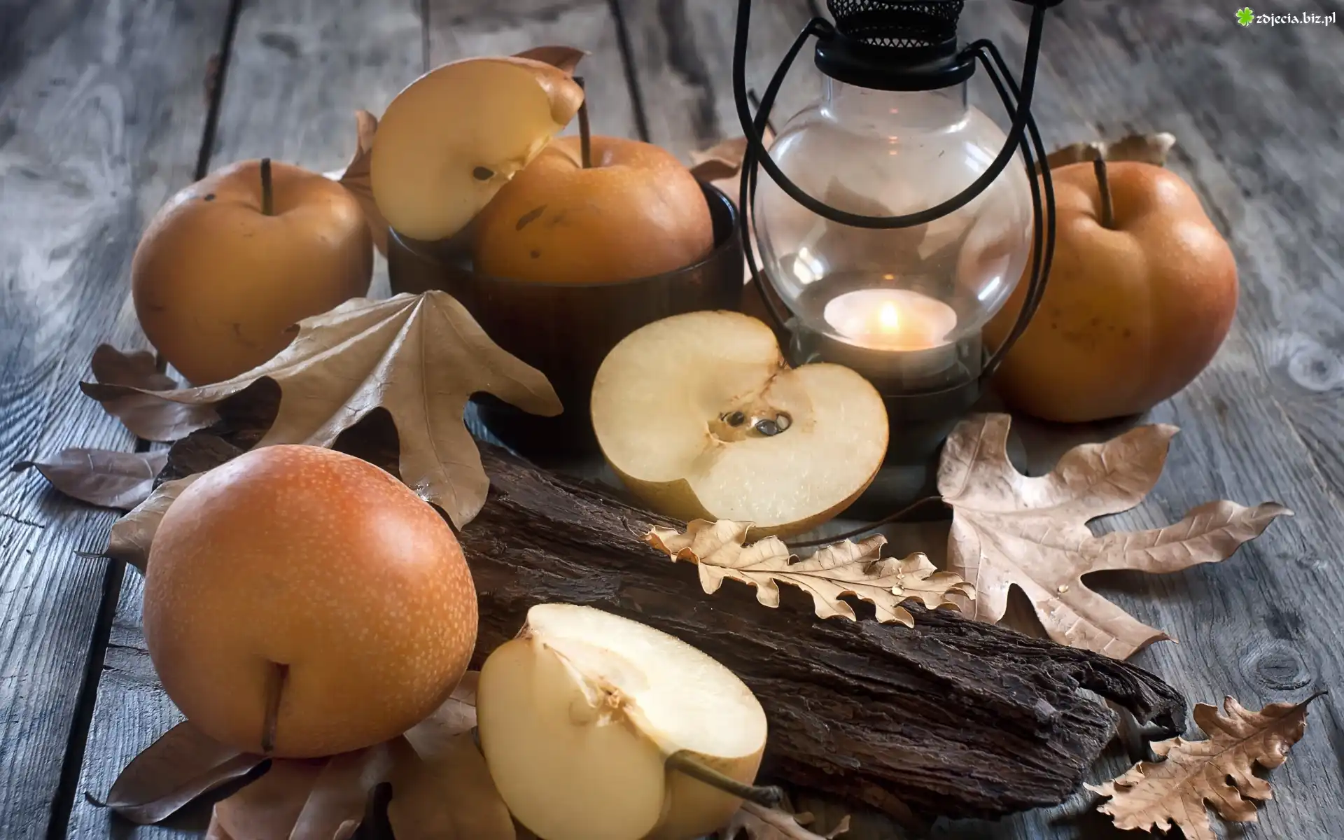Zdjęcie Jabłka, Liście, Lampion, Kora, Kompozycja