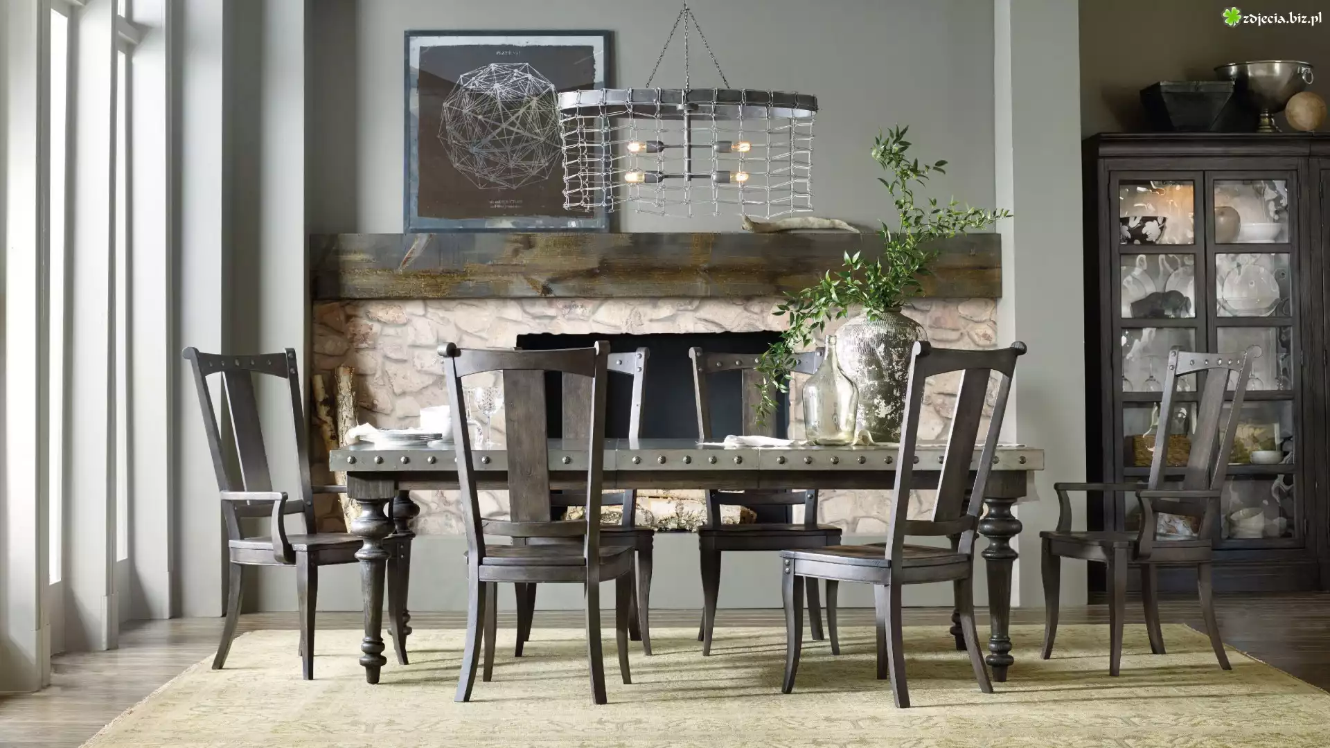 Zdjęcie, Jadalnia, Stół, Krzesła, Kominek