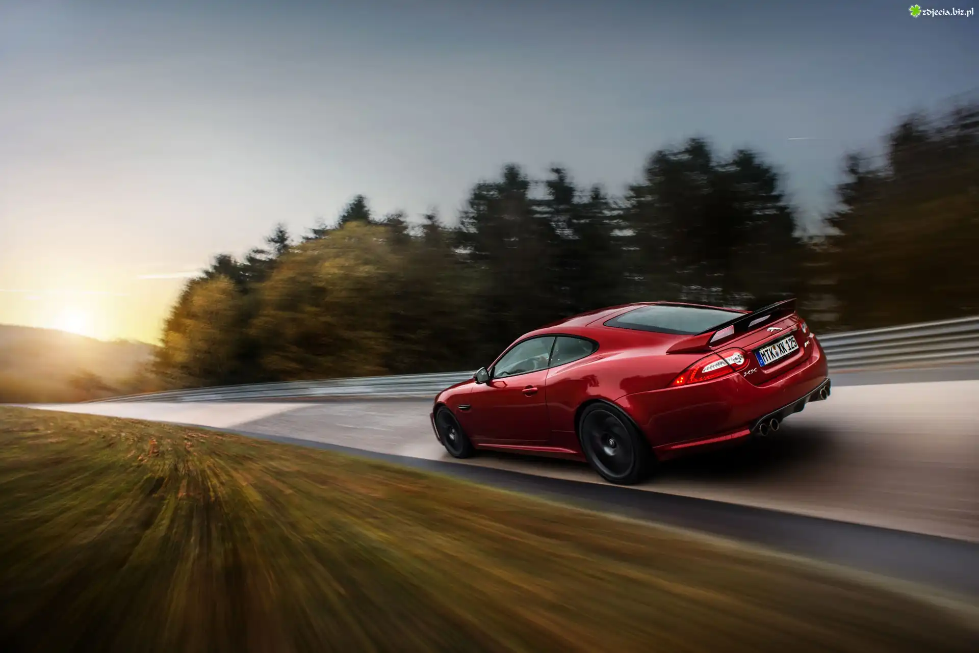 Zdjęcie, Jaguar, XK, Czerwony, Droga, Drzewa
