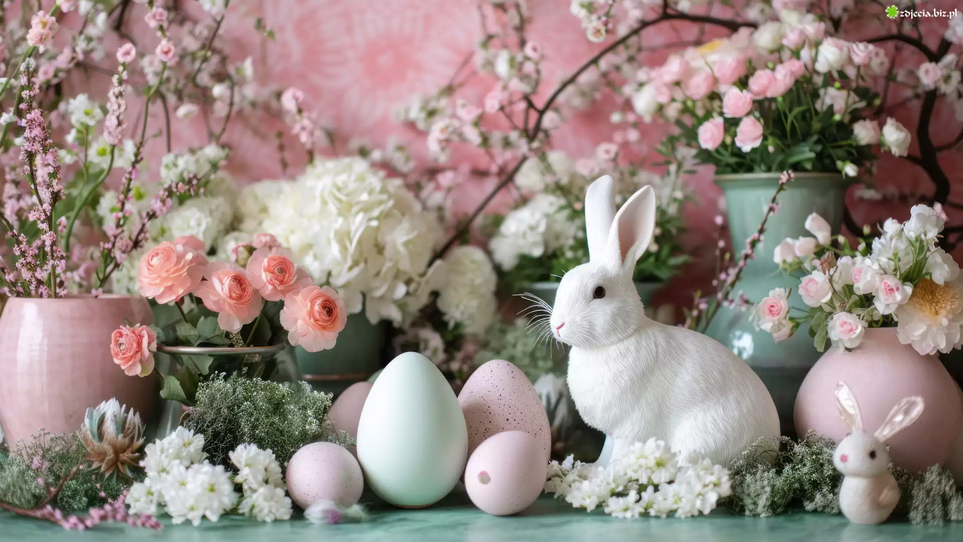 Zdjęcie Wielkanoc, Jajka, Króliczek, Kwiaty, Donice